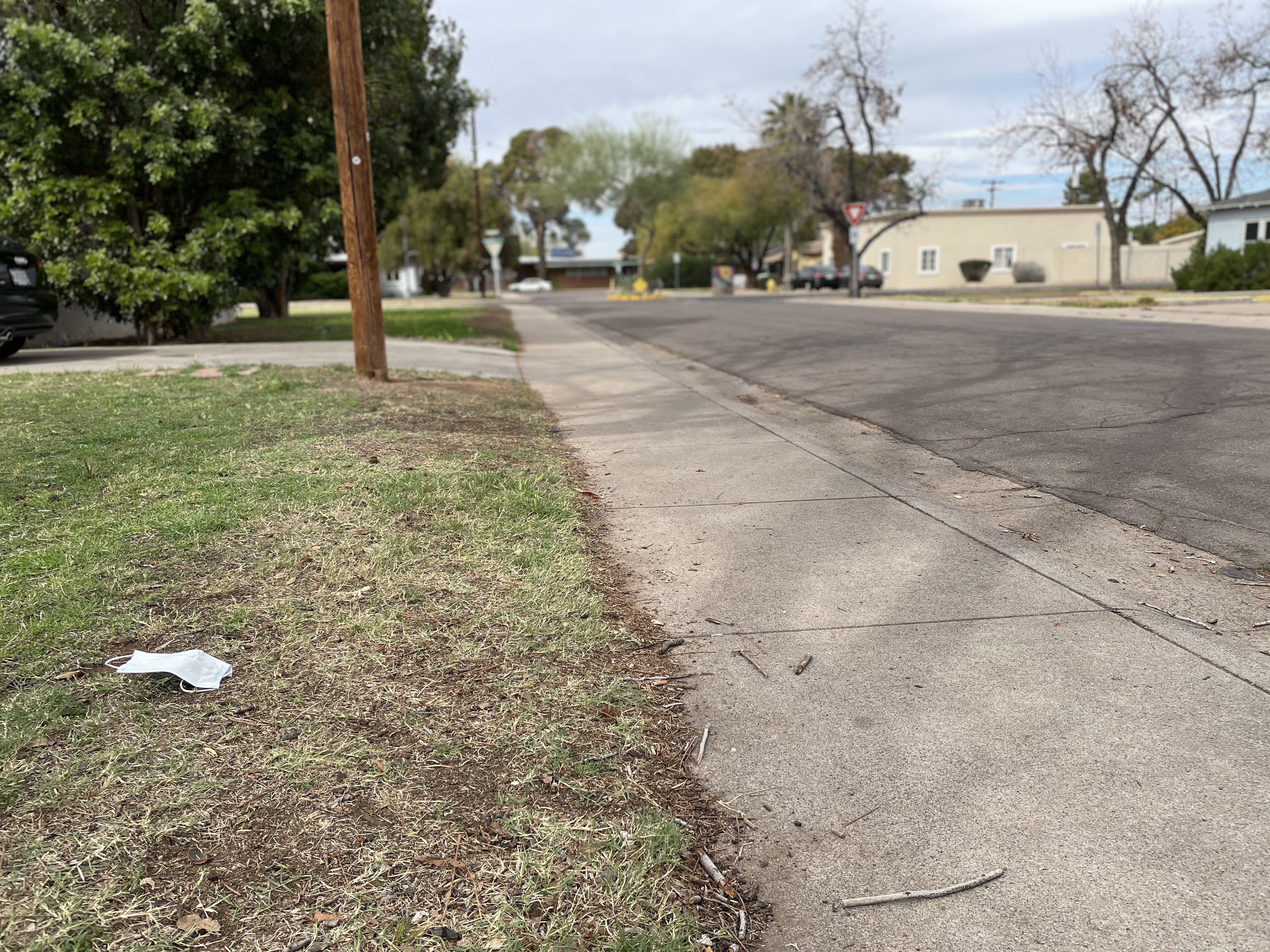 White and blue disposable face mask found near 9th and Roosevelt in Tempe, Arizona.