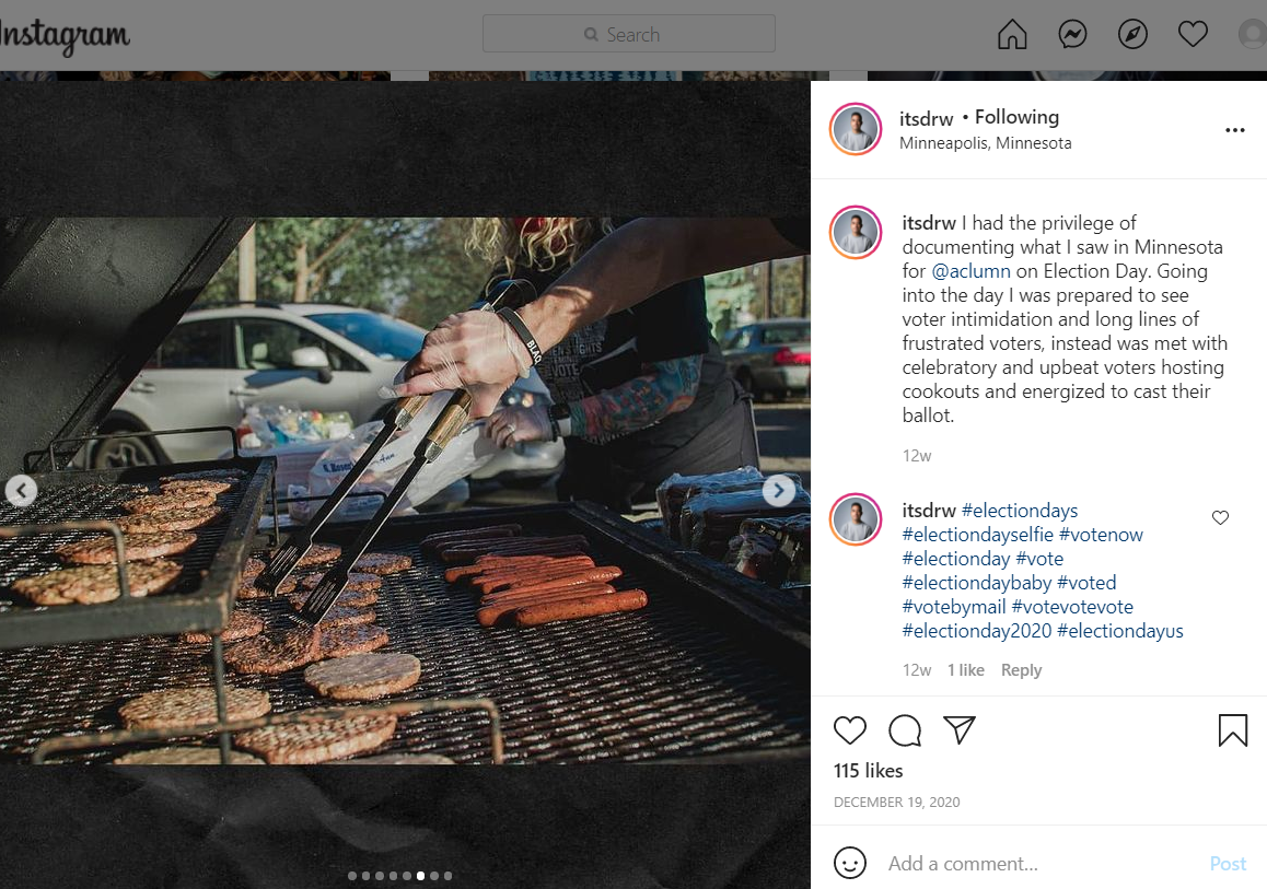 I had the privilege of documenting what I saw in Minnesota for @aclumn on Election Day. Going into the day I was prepared to see voter intimidation and long lines of frustrated voters, instead was met with celebratory and upbeat voters hosting cookouts and energized to cast their ballot.