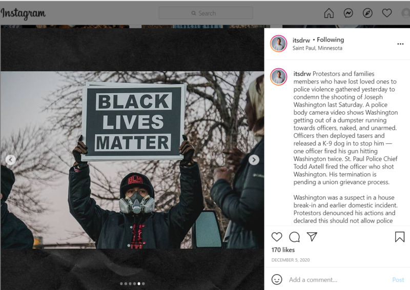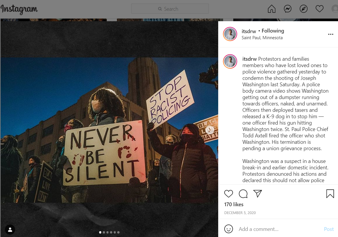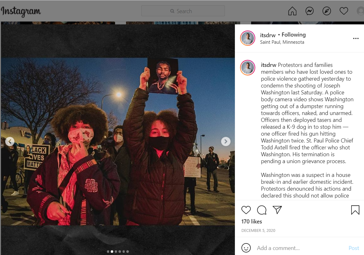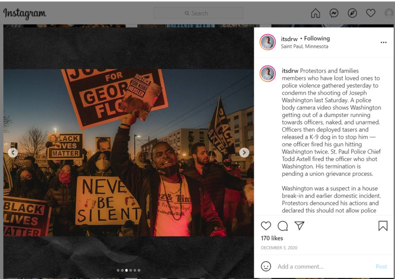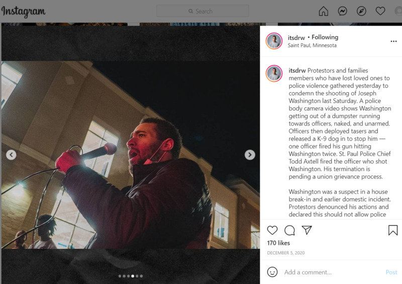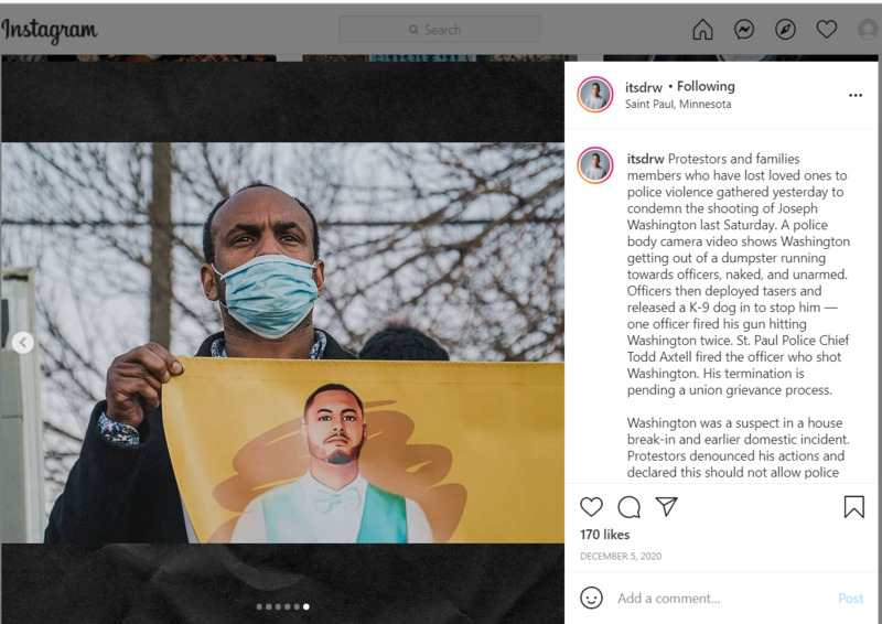 Protestors and families members who have lost loved ones to police violence gathered yesterday to condemn the shooting of Joseph Washington last Saturday. A police body camera video shows Washington getting out of a dumpster running towards officers, naked, and unarmed. Officers then deployed tasers and released a K-9 dog in to stop him — one officer fired his gun hitting Washington twice. St. Paul Police Chief Todd Axtell fired the officer who shot Washington. His termination is pending a union grievance process.