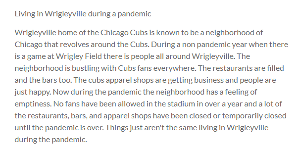 Wrigleyville home of the Chicago Cubs is known to be a neighborhood of Chicago that revolves around the Cubs. During a non pandemic year when there is a game at Wrigley Field there is people all around Wrigleyville. The neighborhood is bustling with Cubs fans everywhere. The restaurants are filled and the bars too. The cubs apparel shops are getting business and people are just happy. Now during the pandemic the neighborhood has a feeling of emptiness. No fans have been allowed in the stadium in over a year and a lot of the restaurants, bars, and apparel shops have been closed or temporarily closed until the pandemic is over. Things just aren't the same living in Wrigleyville during the pandemic.