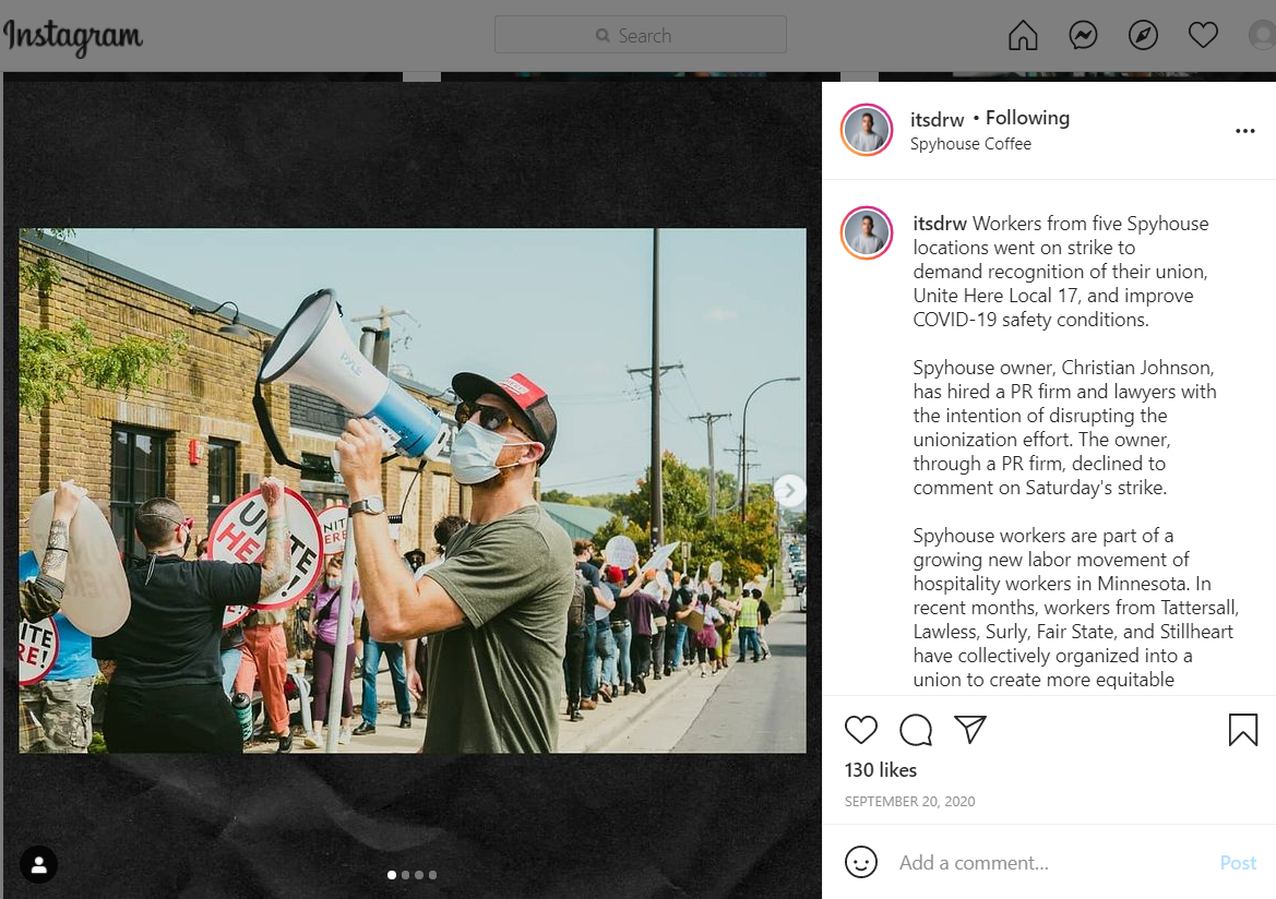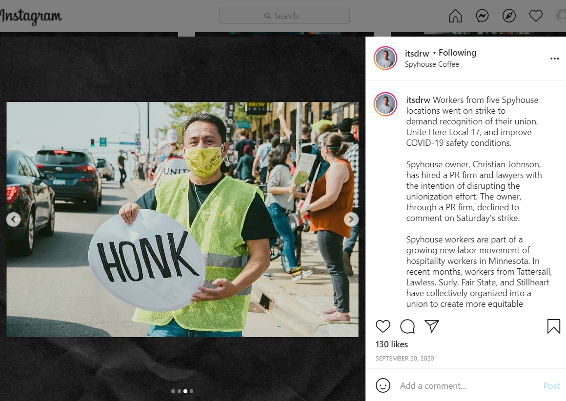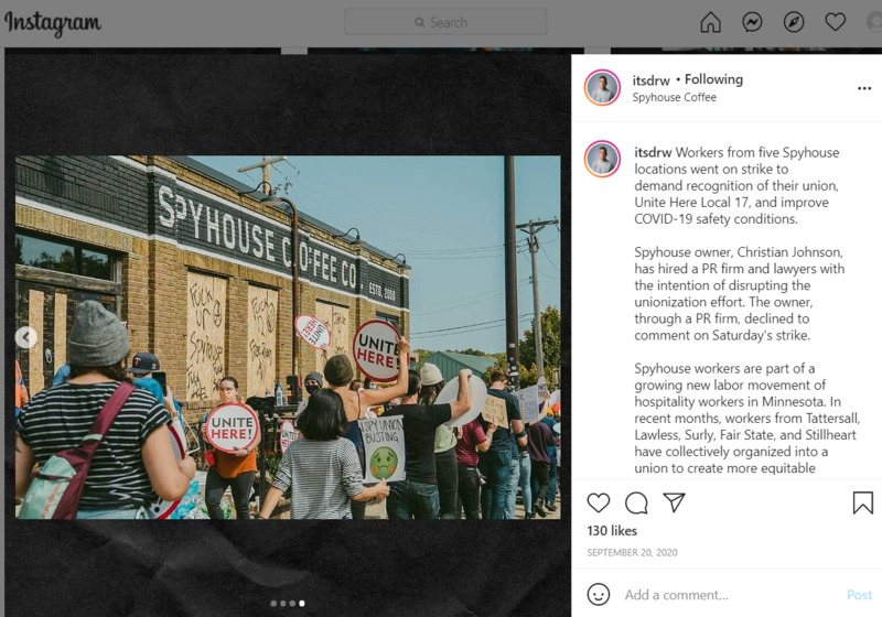 Spyhouse owner, Christian Johnson, has hired a PR firm and lawyers with the intention of disrupting the unionization effort. The owner, through a PR firm, declined to comment on Saturday's strike.