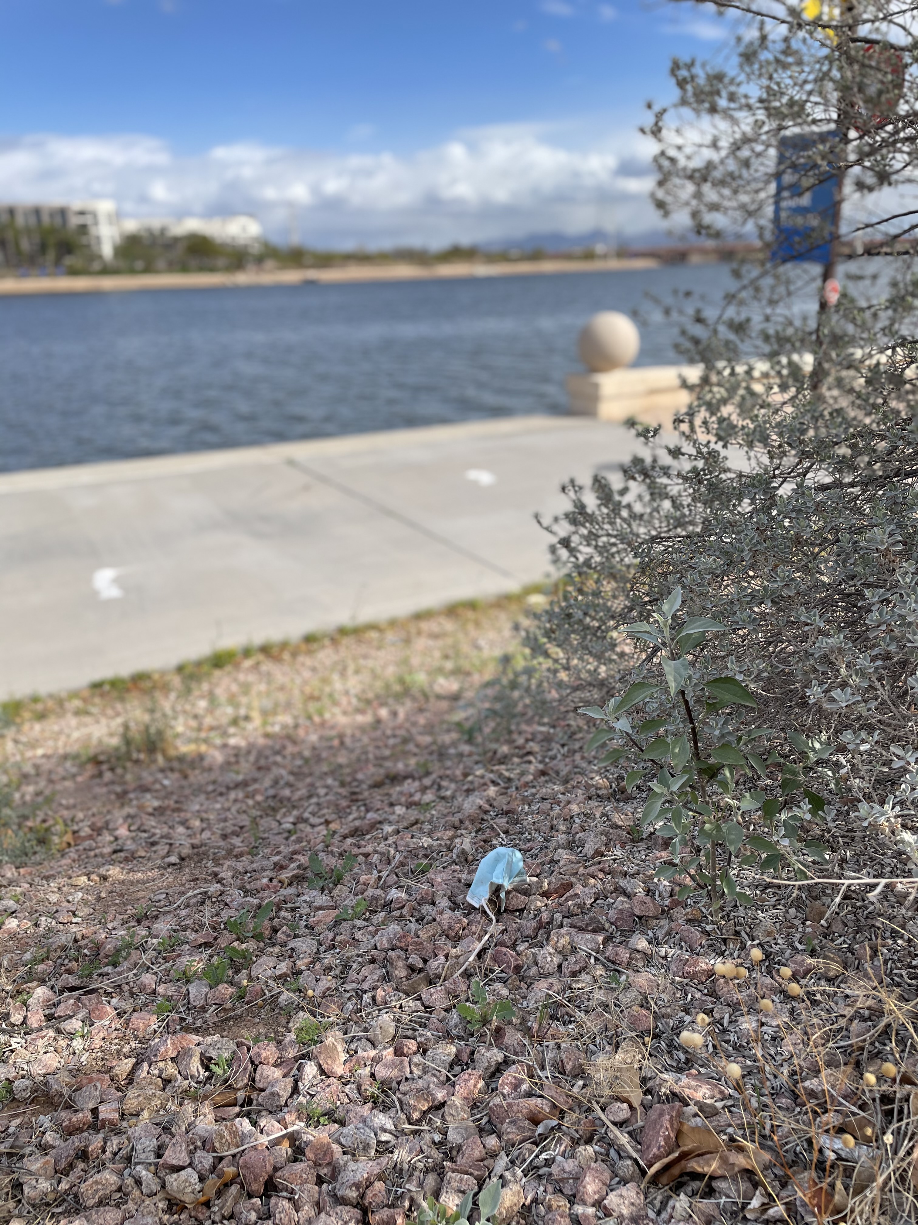 Blue & white disposable face mask east of Rural road found along the South Bank of the riverwalk along Rio Salado.