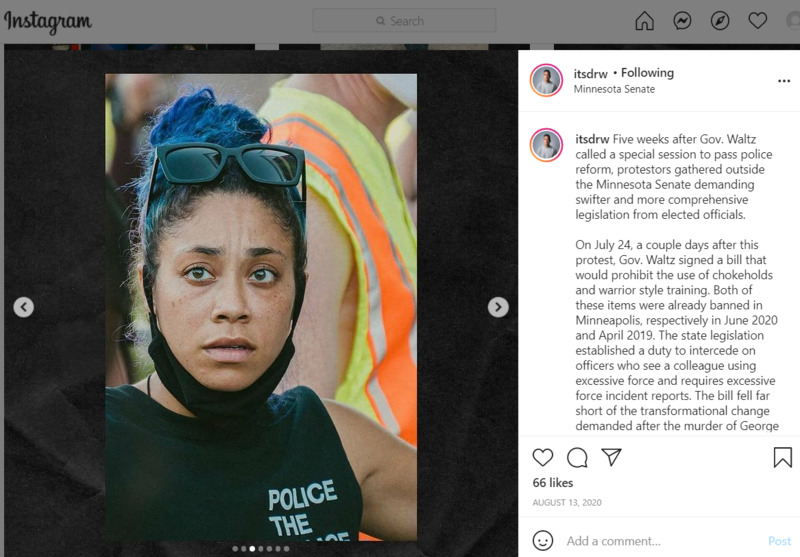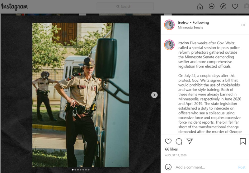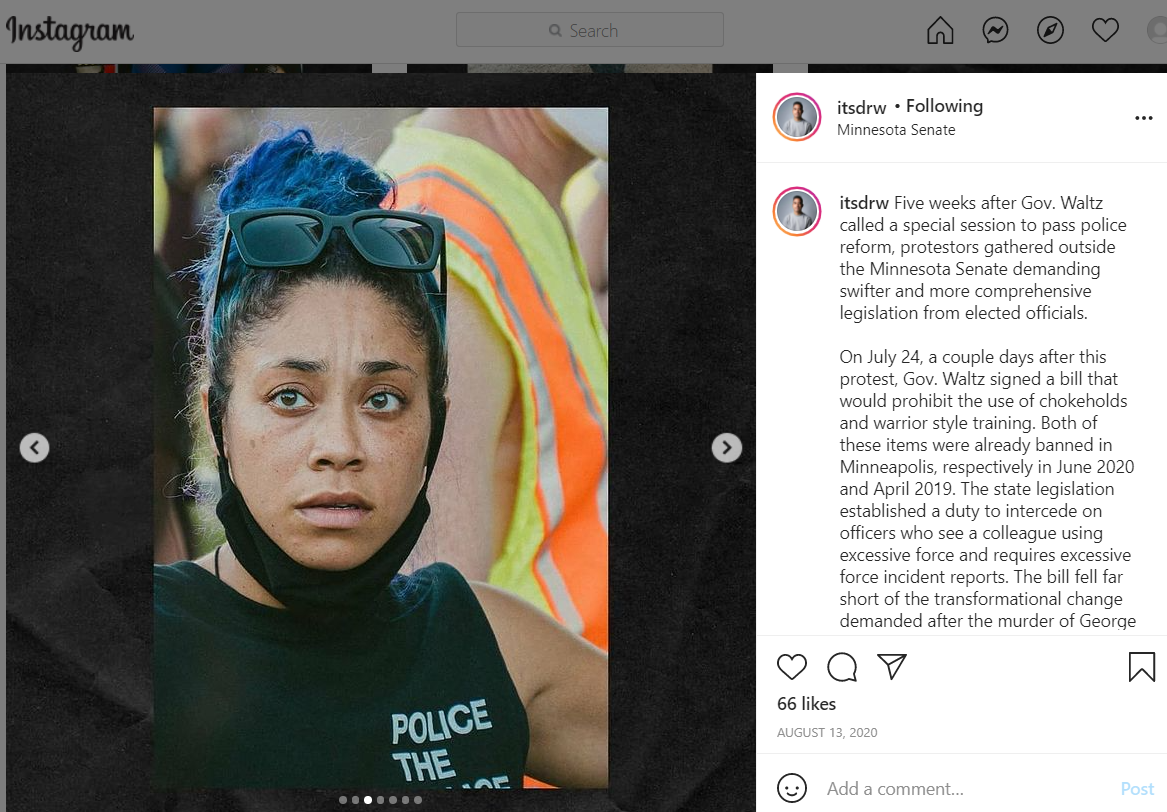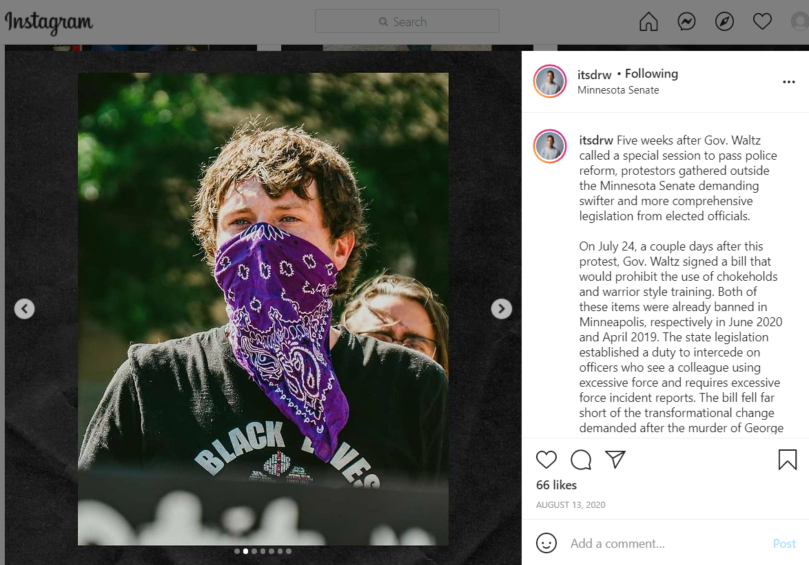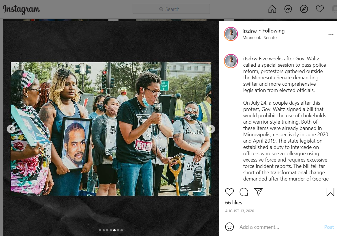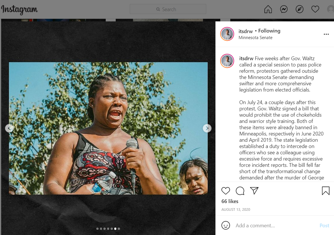 On July 24, a couple days after this protest, Gov. Waltz signed a bill that would prohibit the use of chokeholds and warrior style training. Both of these items were already banned in Minneapolis, respectively in June 2020 and April 2019. The state legislation established a duty to intercede on officers who see a colleague using excessive force and requires excessive force incident reports. The bill fell far short of the transformational change demanded after the murder of George Floyd and represented 'low-hanging fruit' for reform policies.