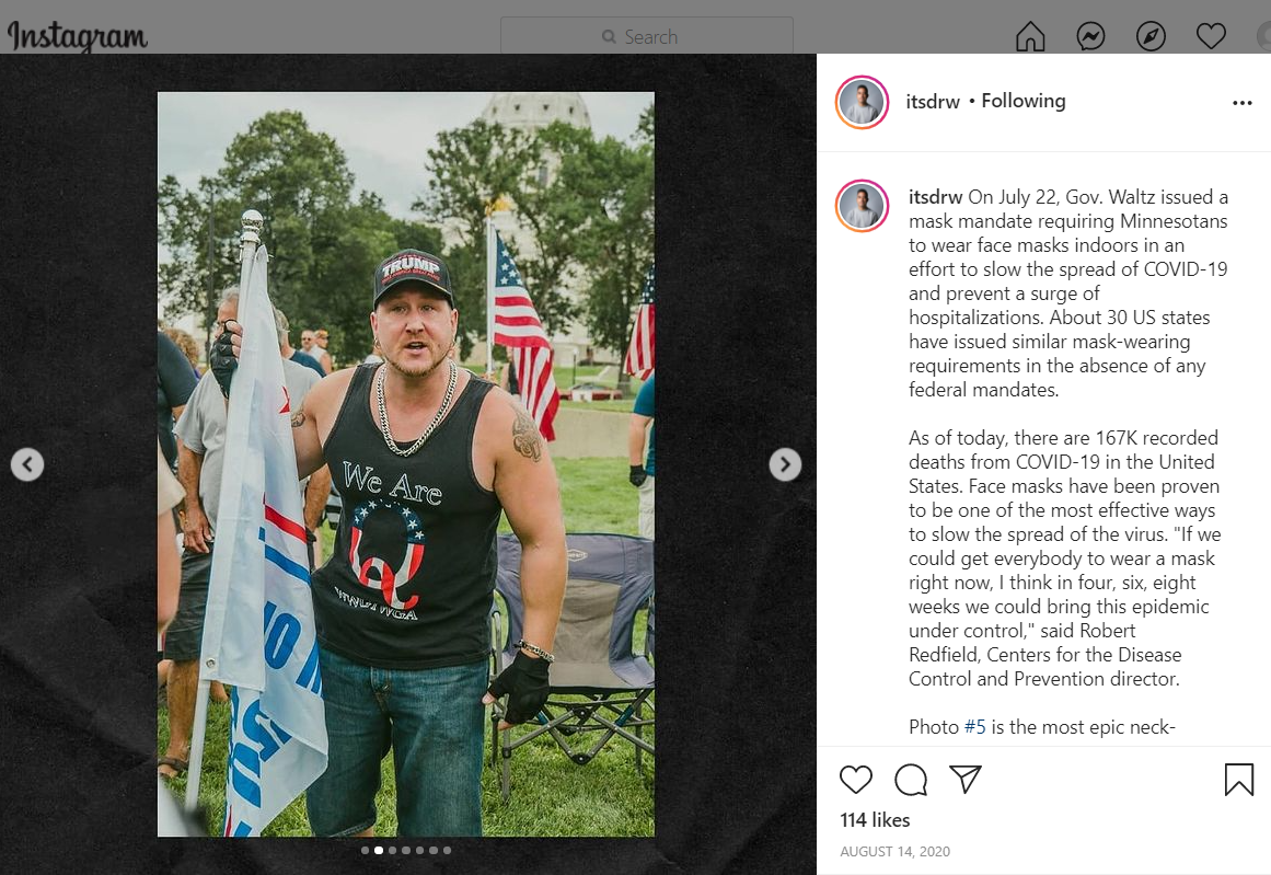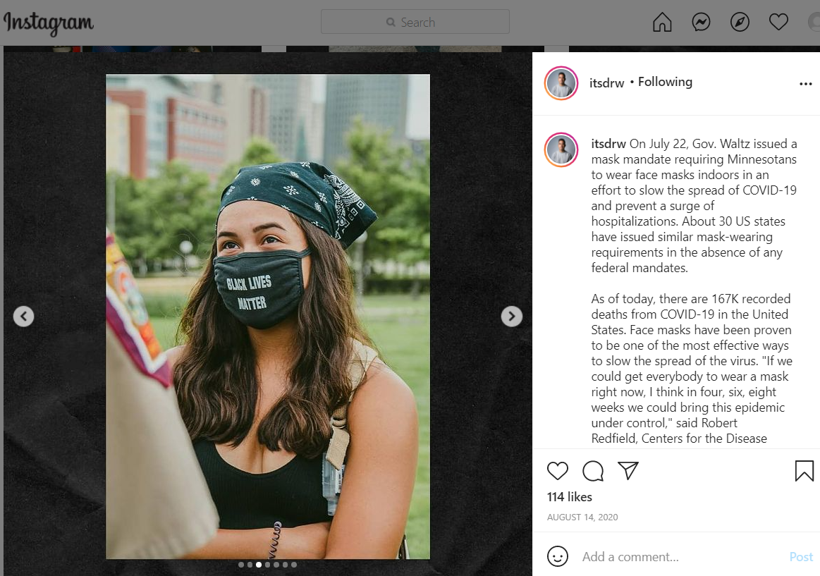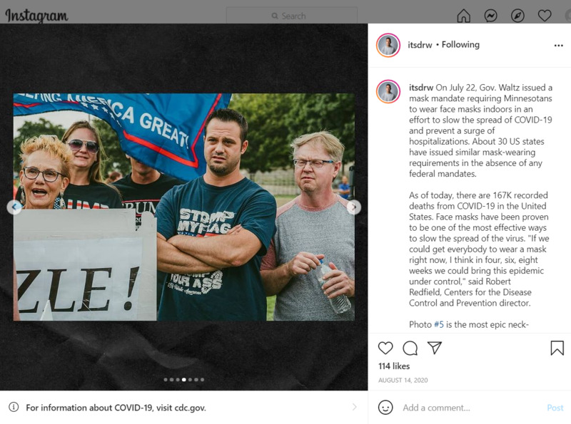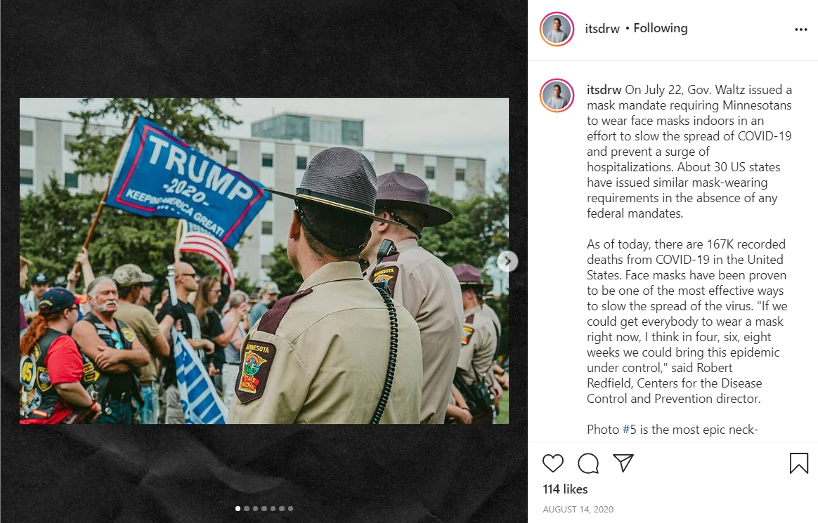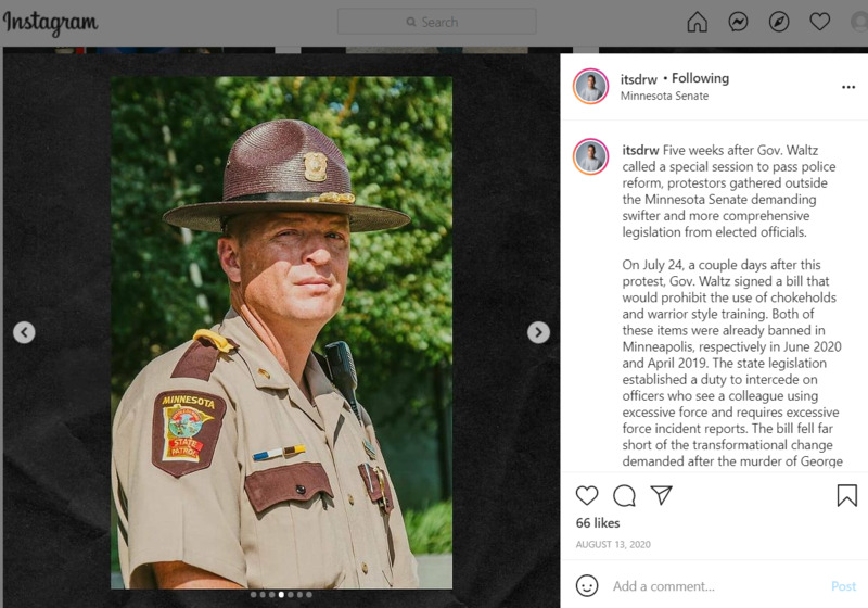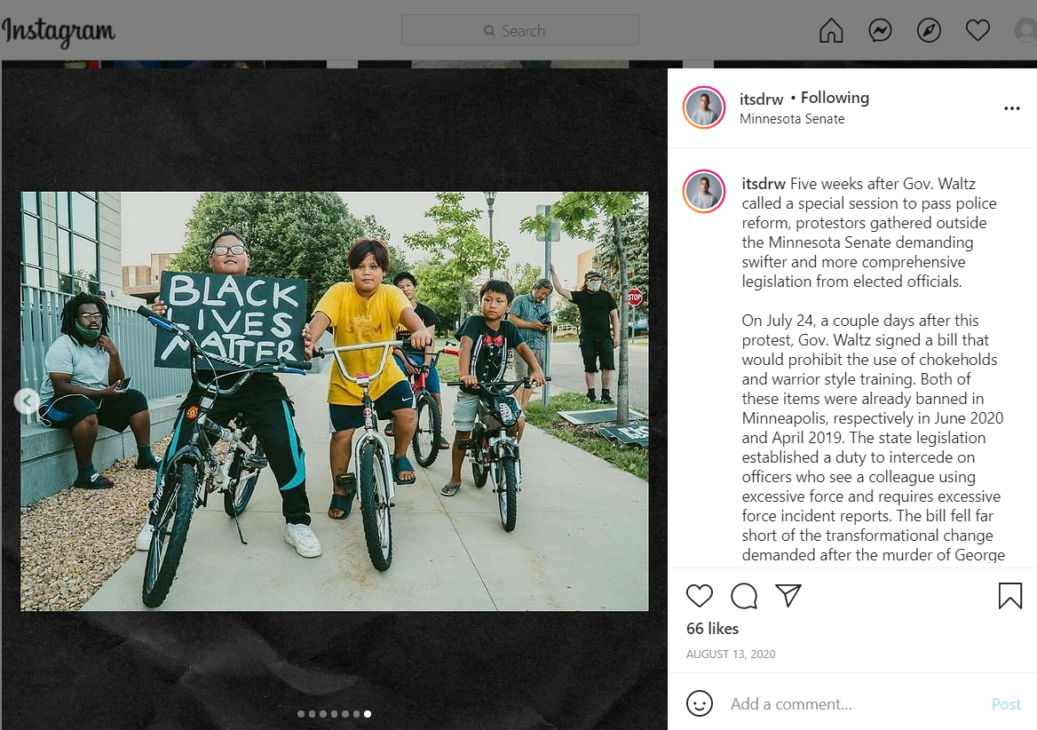 On July 24, a couple days after this protest, Gov. Waltz signed a bill that would prohibit the use of chokeholds and warrior style training. Both of these items were already banned in Minneapolis, respectively in June 2020 and April 2019. The state legislation established a duty to intercede on officers who see a colleague using excessive force and requires excessive force incident reports. The bill fell far short of the transformational change demanded after the murder of George Floyd and represented 'low-hanging fruit' for reform policies.