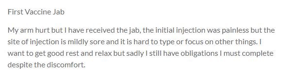 My arm hurt but I have received the jab, the initial injection was painless but the site of injection is mildly sore and it is hard to type or focus on other things. I want to get good rest and relax but sadly I still have obligations I must complete despite the discomfort.