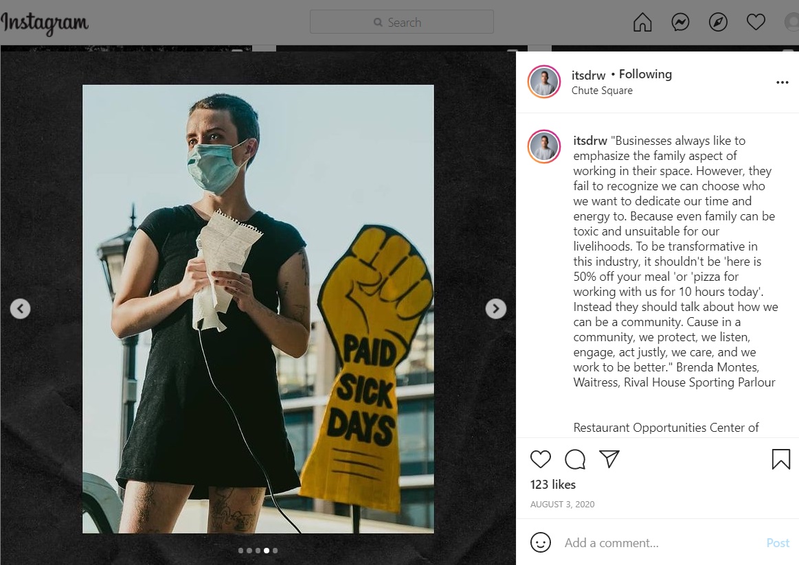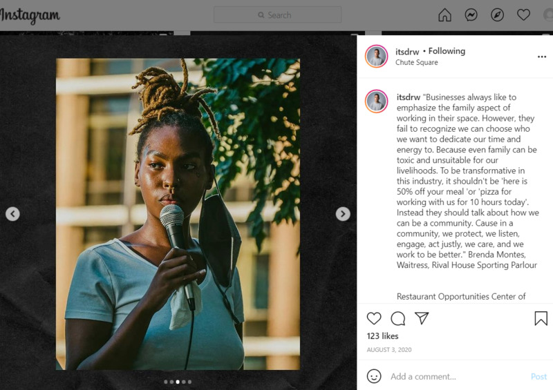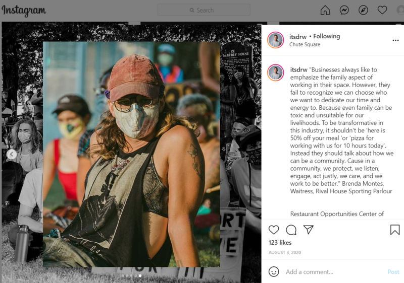 "Businesses always like to emphasize the family aspect of working in their space. However, they fail to recognize we can choose who we want to dedicate our time and energy to. Because even family can be toxic and unsuitable for our livelihoods. To be transformative in this industry, it shouldn't be 'here is 50% off your meal 'or 'pizza for working with us for 10 hours today'. Instead they should talk about how we can be a community. Cause in a community, we protect, we listen, engage, act justly, we care, and we work to be better." Brenda Montes, Waitress, Rival House Sporting Parlour