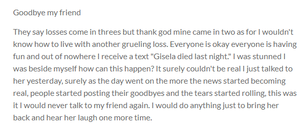 They say losses come in threes but thank god mine came in two as for I wouldn't know how to live with another grueling loss. Everyone is okay everyone is having fun and out of nowhere I receive a text "Gisela died last night." I was stunned I was beside myself how can this happen? It surely couldn't be real I just talked to her yesterday, surely as the day went on the more the news started becoming real, people started posting their goodbyes and the tears started rolling, this was it I would never talk to my friend again. I would do anything just to bring her back and hear her laugh one more time.