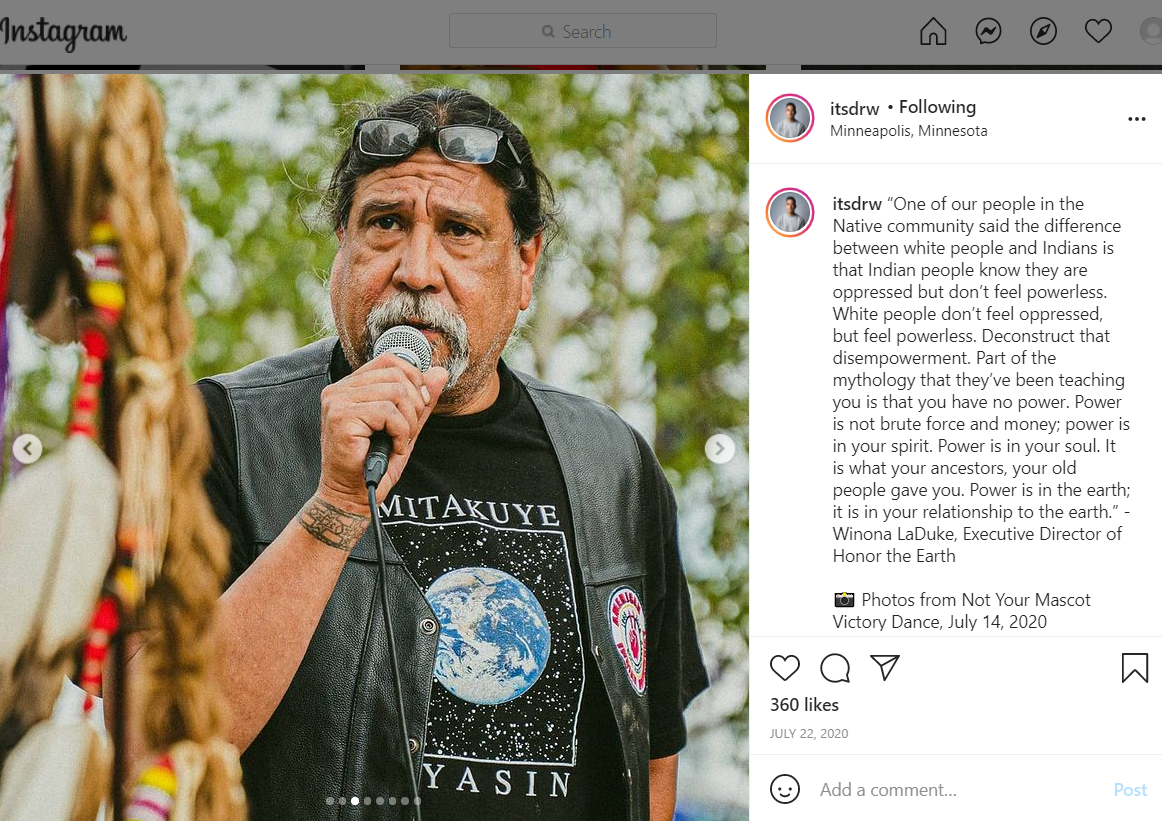 “One of our people in the Native community said the difference between white people and Indians is that Indian people know they are oppressed but don’t feel powerless. White people don’t feel oppressed, but feel powerless. Deconstruct that disempowerment. Part of the mythology that they’ve been teaching you is that you have no power. Power is not brute force and money; power is in your spirit. Power is in your soul. It is what your ancestors, your old people gave you. Power is in the earth; it is in your relationship to the earth.” - Winona LaDuke, Executive Director of Honor the Earth