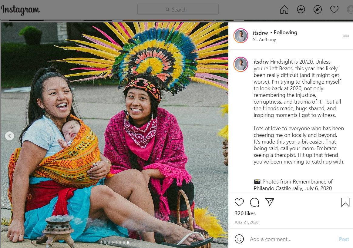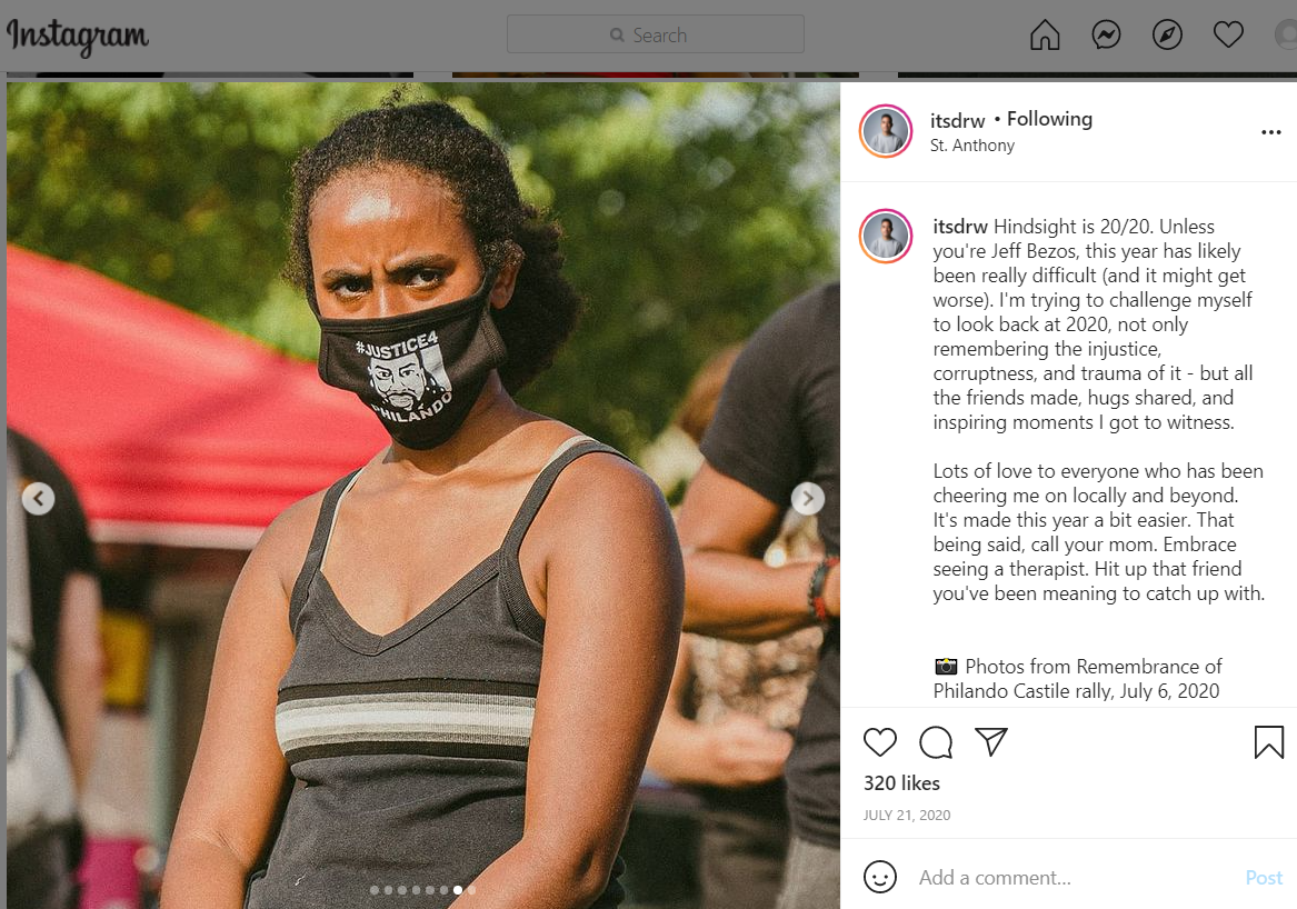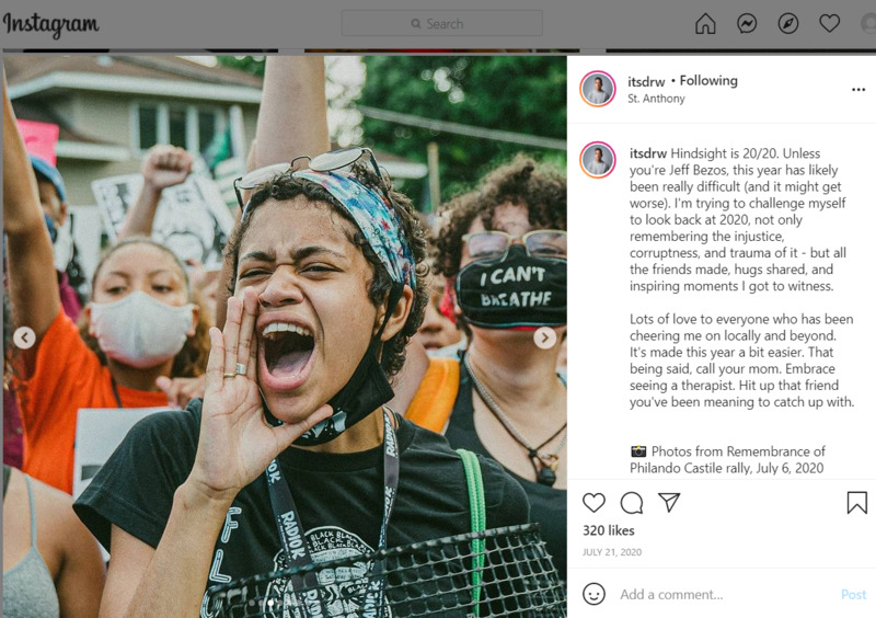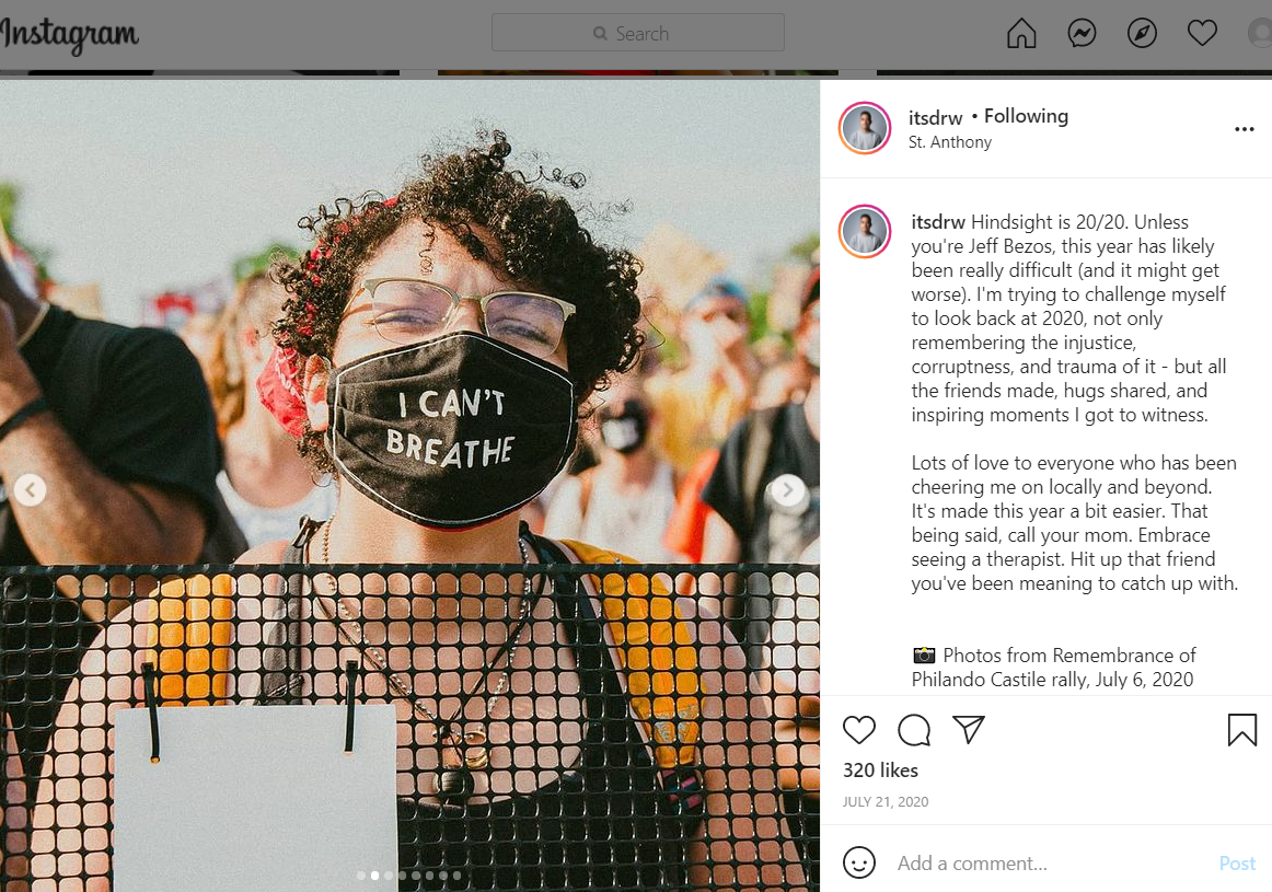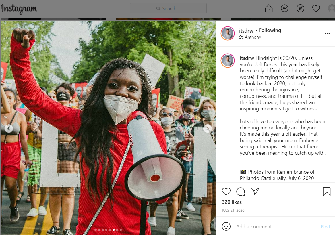Hindsight is 20/20. Unless you're Jeff Bezos, this year has likely been really difficult (and it might get worse). I'm trying to challenge myself to look back at 2020, not only remembering the injustice, corruptness, and trauma of it - but all the friends made, hugs shared, and inspiring moments I got to witness.