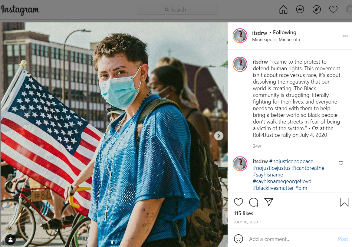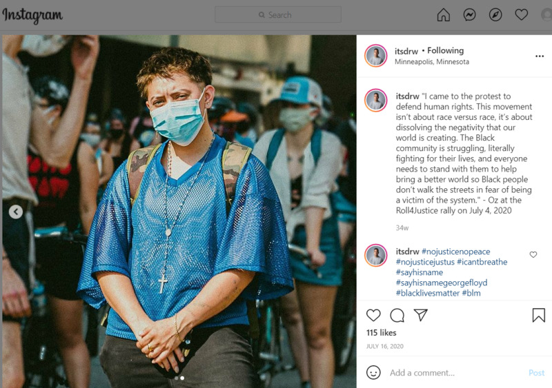 "I came to the protest to defend human rights. This movement isn’t about race versus race, it’s about dissolving the negativity that our world is creating. The Black community is struggling, literally fighting for their lives, and everyone needs to stand with them to help bring a better world so Black people don’t walk the streets in fear of being a victim of the system." - Oz at the Roll4Justice rally on July 4, 2020