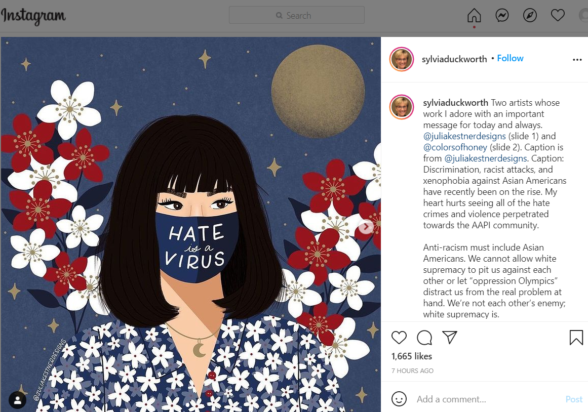Two artists whose work I adore with an important message for today and always. @juliakestnerdesigns (slide 1) and @colorsofhoney (slide 2). Caption is from @juliakestnerdesigns. Caption: Discrimination, racist attacks, and xenophobia against Asian Americans have recently been on the rise. My heart hurts seeing all of the hate crimes and violence perpetrated towards the AAPI community.