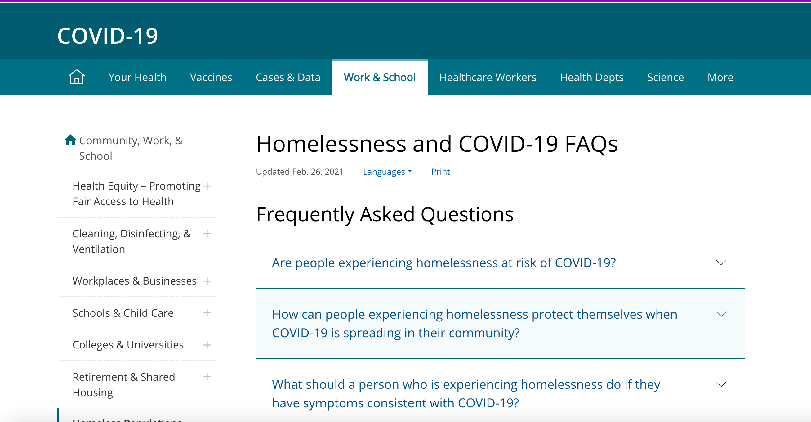 This is an article of the CDC FAQ on homeless as it relates specifically to COVID and the unique impacts that homeless populations are facing as a result of COVID.