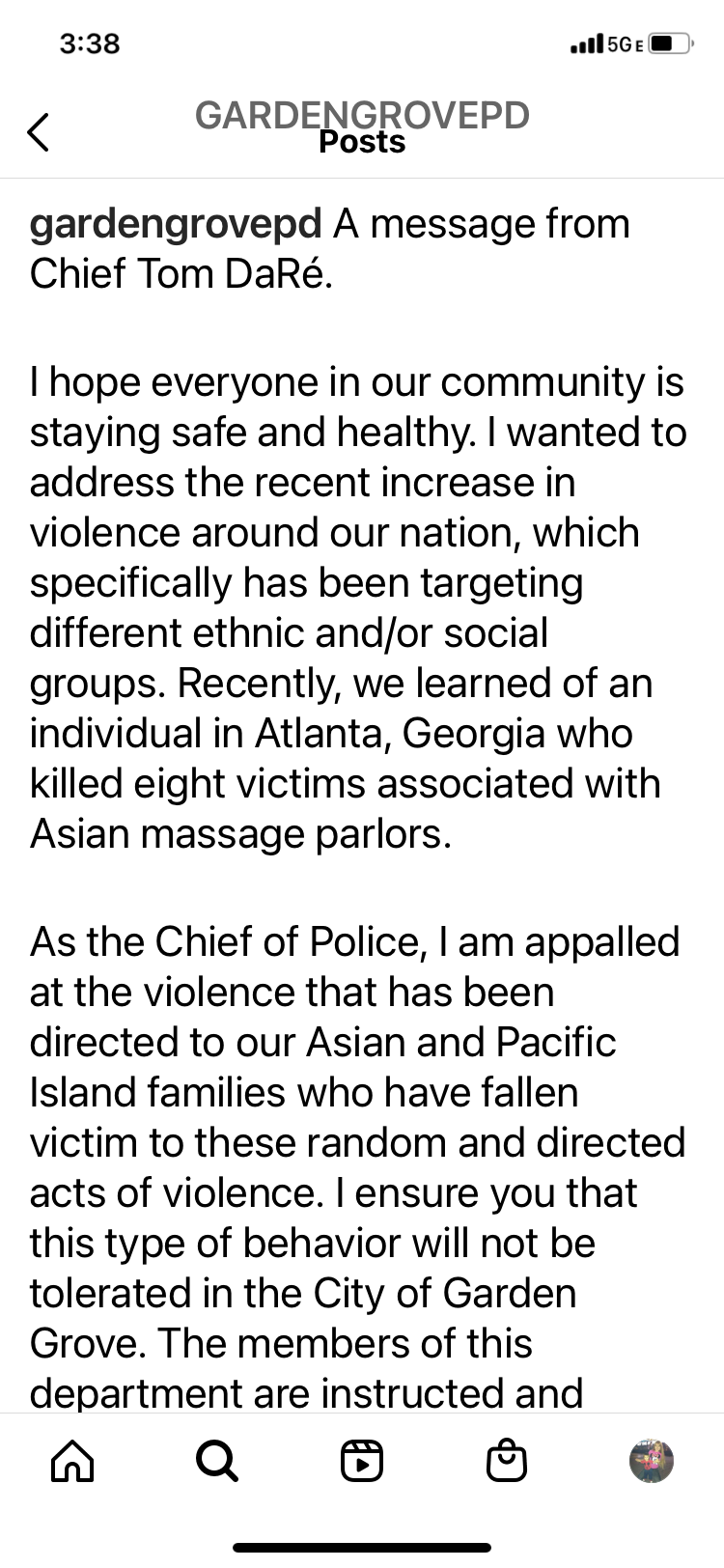 The rise of anti-Asian crimes has been a focal point of my predominantly Asian and Latinx community, and has increased to a point where our local police are trying to send out messages of reassurance and solidarity. But this isn’t something that comes out of nowhere. It has been bubbling under the surface as long as Asian Americans have lived in this country. The Chinese Exclusion Act, barring Asian citizenship, miscegenation laws, land laws, internment camps, the murder of Vincent Chin, hate crimes against Southeast Asian refugees, the stereotypes, the cheap sitcom jokes and potshots, the dual embrace and distaste of the so-called “model minority.” A year ago, as COVID-19 began to infect our everyday life even prior to shutdown, many of my students recounted racism they faced at the grocery store or other public places, as Asians were made the scapegoat of the pandemic. This racism was not happening in the Midwest, it was happening in diverse Southern California. How many times this year have I had the conversation with students, family, and friends about the otherness that is associated with being Asian in America? As half of an interracial marriage with an Asian partner, I have seen first hand the comments. Going to Disney World and having my husband joke that he had seen one and a half Asians that week, himself and my daughter - and seeing the stares. Comments from Disney World or airport employees who stared at us and said in a off putting tone, “you must be from California or Hawai’i,” to which I shot back with “why, because we’re so happy and relaxed?” They didn’t crack a smile. Or my husband’s best friend, who in medical residency in Kansas City was approached in a Panera Bread with a man saying “whaaa, you want to fight Bruce Lee” and being asked by his medical resident roommates to translate Ninja Warrior for them because he “knows Chinese” (he’s third generation Japanese American). The friend in grad school in Michigan who, while walking down the street, was met by women who held the corners of their eyes and chanted “ching chong, ching chong.” Never once has anyone repeated the question “where are you from” when I tell someone I am from California. My Asian American husband is always asked at least twice. Also from California, when he responds to the simple question of where is he from with “California,”there is always the tone change and the slowed down, “No, where are you FROM?” Because the underlying, uncomfortable reality is that apparently if you’re Asian, you can’t be “from” America. Your identity is forever a hyphen. But this was not part of the public conscience until recently. With the rhetoric of leadership that continually blamed China for COVID-19, using ethnically offensive names, the acts of racism my students were experiencing in March have evolved into full fledged violence and crime, peaking yesterday with a shooting. Here we are in another moment when COVID-19 has uncovered the ugliness that lies beneath the surface in a country that calls itself a democracy. A country where the police spokesperson tried to explain away the targeted murder of eight Asian women yesterday by saying the Caucasian male shooter was having a “bad day.” No justice, no peace sounds hollow when you wonder if there ever will be either.