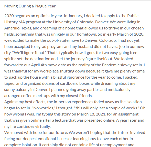 2020 began as an optimistic year. In January, I decided to apply to the Public History MA program at the University of Colorado, Denver. We were living in Amarillo, Texas, and dreaming of a home that allowed us to thrive in our chosen fields, something that was unlikely in our hometown. So in early March of 2020, we decided to make the out-of-state move to Denver, Colorado. I had not yet been accepted to a grad program, and my husband did not have a job in our new city. "We'll figure it out." That's typically how it goes for two easy-going free spirits: set the destination and let the journey figure itself out. We looked forward to our April 4th move date as the reality of the Pandemic slowly set in. I was thankful for my workplace shutting down because it gave me plenty of time to pack up the house with a blissful ignorance for the year to come. I packed, taped, and organized dozens of cardboard boxes while dreaming about my sunny balcony in Denver. I planned going away parties and meticulously arranged coffee meet-ups with my closest friends.