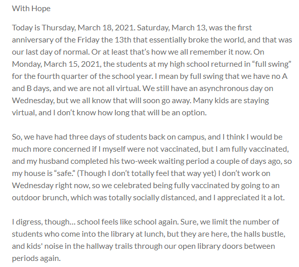 Today is Thursday, March 18, 2021. Saturday, March 13, was the first anniversary of the Friday the 13th that essentially broke the world, and that was our last day of normal. Or at least that’s how we all remember it now. On Monday, March 15, 2021, the students at my high school returned in “full swing” for the fourth quarter of the school year. I mean by full swing that we have no A and B days, and we are not all virtual. We still have an asynchronous day on Wednesday, but we all know that will soon go away. Many kids are staying virtual, and I don’t know how long that will be an option.