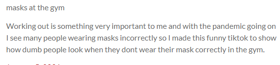Working out is something very important to me and with the pandemic going on I see many people wearing masks incorrectly so I made this funny tiktok to show how dumb people look when they dont wear their mask correctly in the gym.