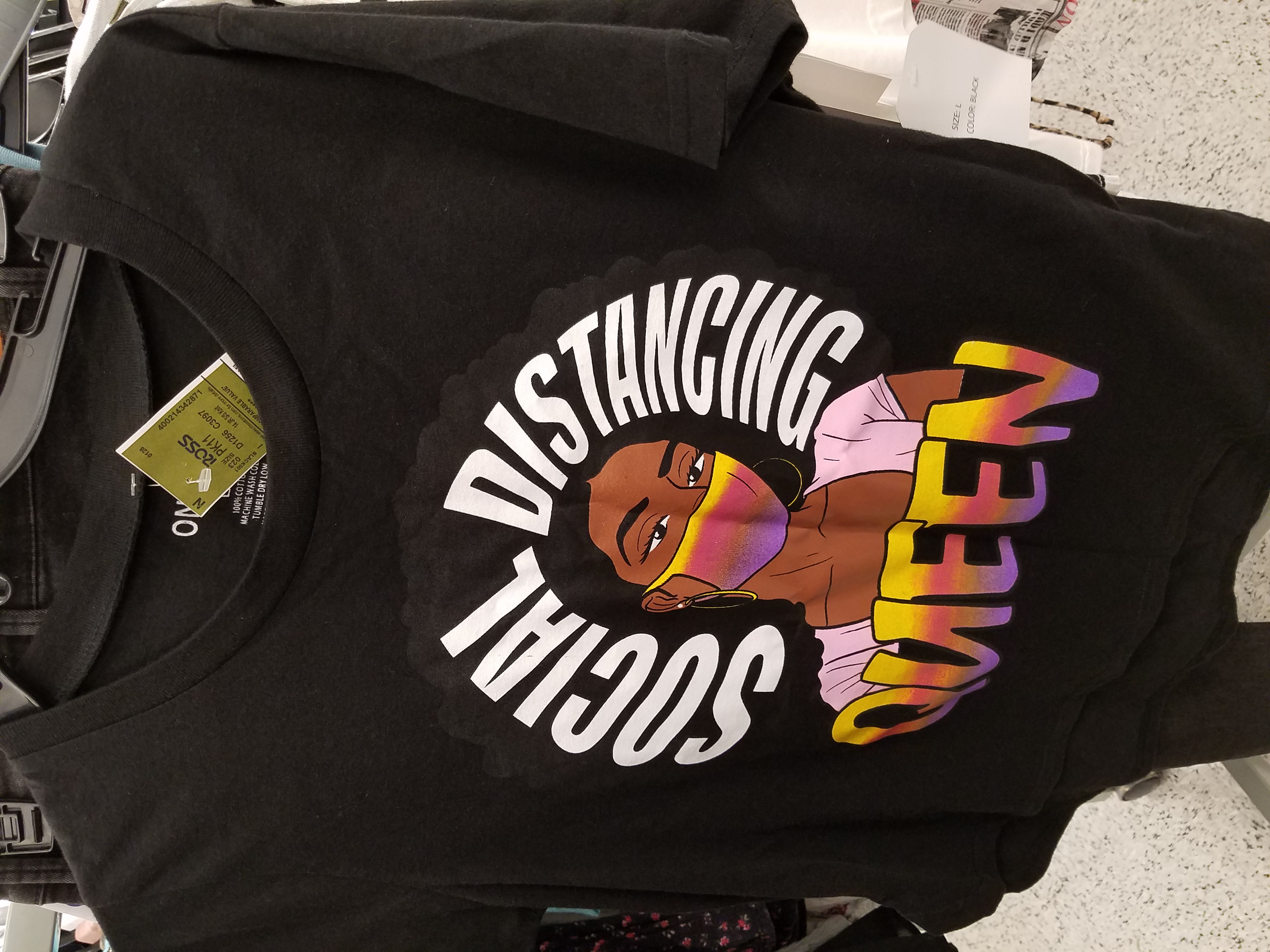 This is another COVID-19 inspired shirt from the same Ross in Round Rock TX. It shows an African American woman with an afro wearing a orange, yellow, pink, and purple mask. written on her hair is "Social distancing" and beneath her is written "queen". This is the first example I had seen of Corona themed vocabulary appearing on a clothing item. This shirt states that the woman in the picture, and the wearer of the shirt, are social distancing experts. It also implies by the word "expert" that the person wearing the shirt is very diligent in making sure they follow the proper social distancing requirements because they want to do their best to protect others. The term "queen" according to Lilian Esene is a specific cultural reference to "a collective effort to overwrite the negative connotations [of certain terms] that, historically, have often been associated with" undervaluing and demeaning "black people". "It’s all done to contrast the way that our history and our persons have been portrayed in school curriculums, books and the media" she states in her article on The Gazette website.