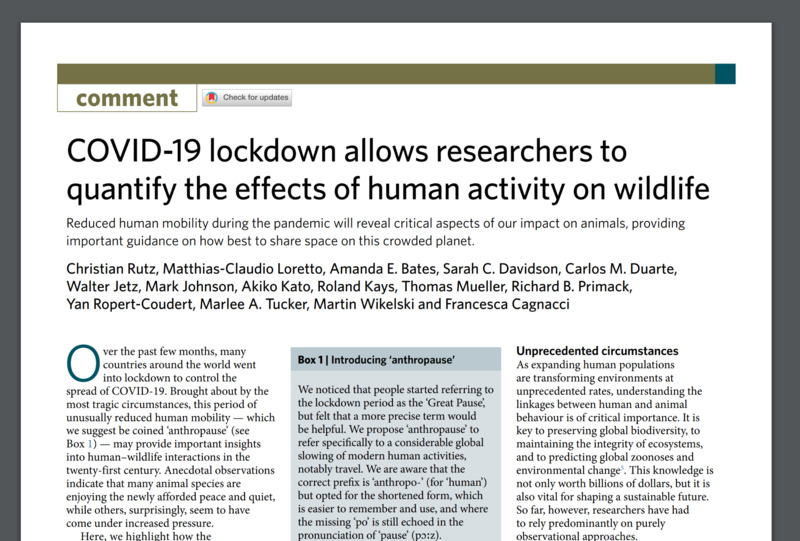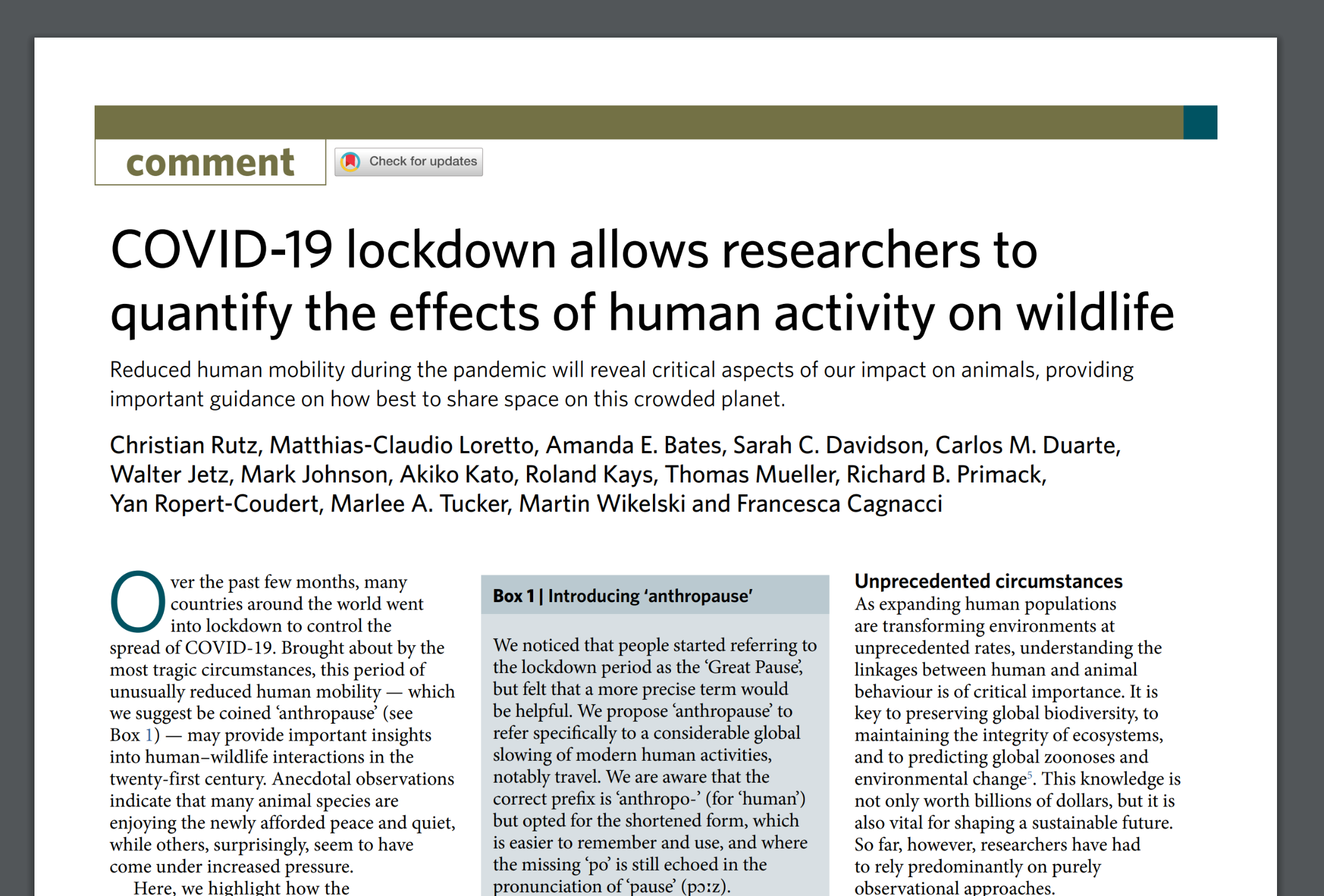 This article is telling readers about how cover-19 has allowed researchers to figure out more on how humans have an effect on wildlife. With less humans going out there may be a change to see.