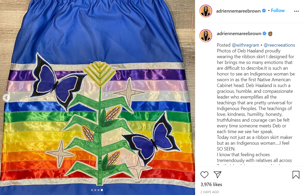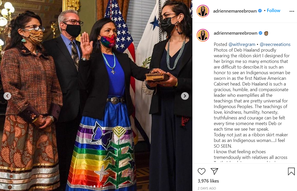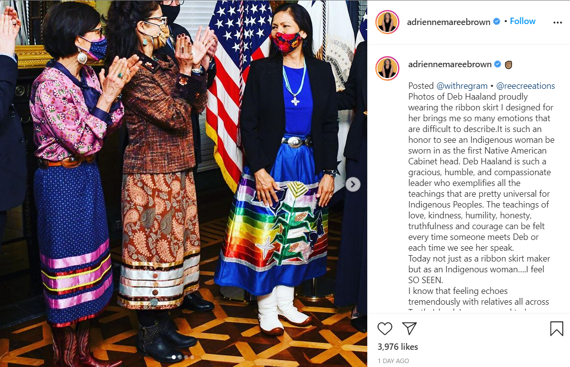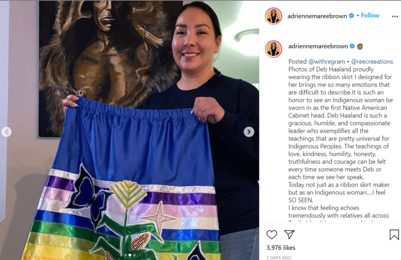 Photos of Deb Haaland proudly wearing the ribbon skirt I designed for her brings me so many emotions that are difficult to describe.It is such an honor to see an Indigenous woman be sworn in as the first Native American Cabinet head. Deb Haaland is such a gracious, humble, and compassionate leader who exemplifies all the teachings that are pretty universal for Indigenous Peoples. The teachings of love, kindness, humility, honesty, truthfulness and courage can be felt every time someone meets Deb or each time we see her speak.