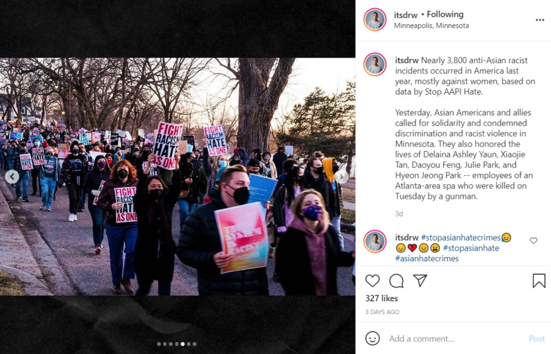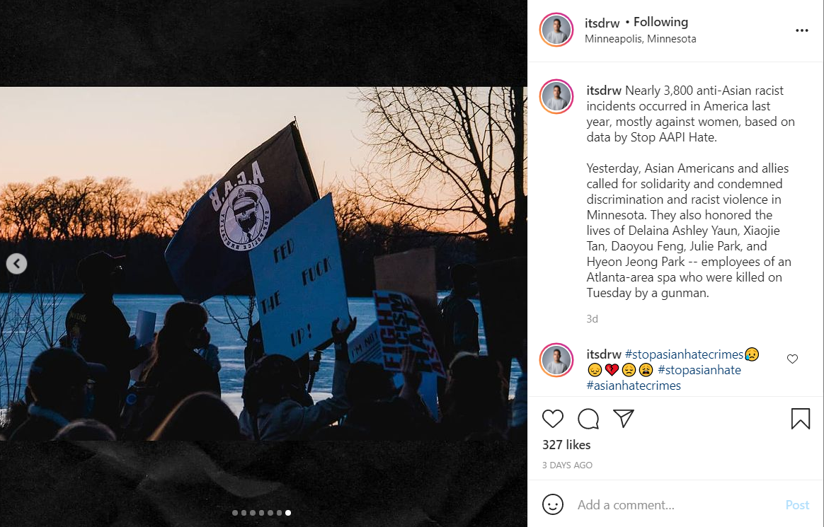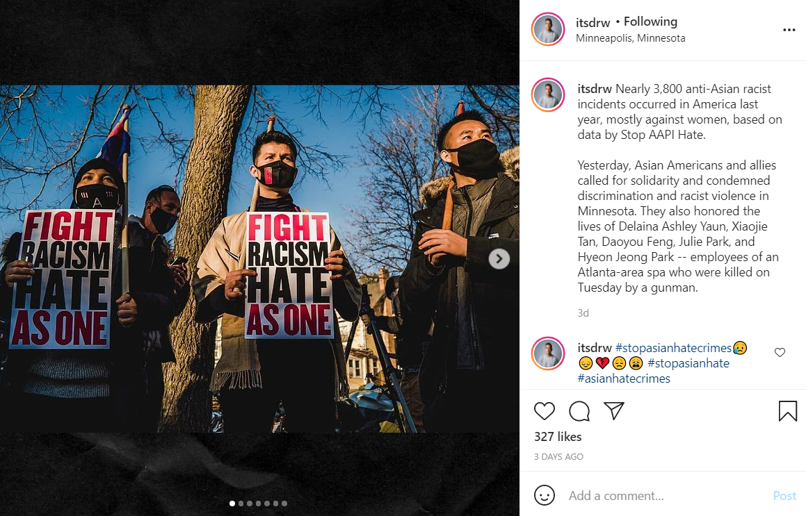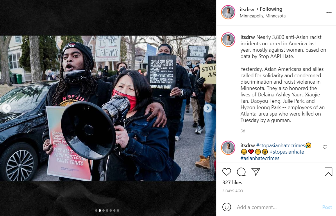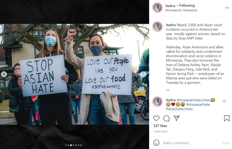 Yesterday, Asian Americans and allies called for solidarity and condemned discrimination and racist violence in Minnesota. They also honored the lives of Delaina Ashley Yaun, Xiaojie Tan, Daoyou Feng, Julie Park, and Hyeon Jeong Park -- employees of an Atlanta-area spa who were killed on Tuesday by a gunman.