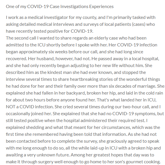I work as a medical investigator for my county, and I'm primarily tasked with asking detailed medical interviews and surveys of local patients (cases) who have recently tested positive for COVID-19.