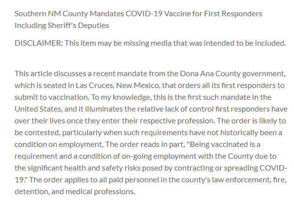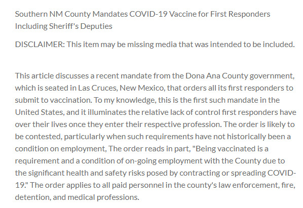 This article discusses a recent mandate from the Dona Ana County government, which is seated in Las Cruces, New Mexico, that orders all its first responders to submit to vaccination. To my knowledge, this is the first such mandate in the United States, and it illuminates the relative lack of control first responders have over their lives once they enter their respective profession. The order is likely to be contested, particularly when such requirements have not historically been a condition on employment, The order reads in part, "Being vaccinated is a requirement and a condition of on-going employment with the County due to the significant health and safety risks posed by contracting or spreading COVID-19." The order applies to all paid personnel in the county's law enforcement, fire, detention, and medical professions.