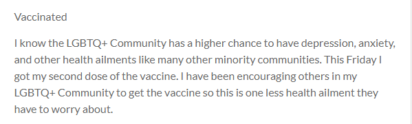 I know the LGBTQ+ Community has a higher chance to have depression, anxiety, and other health ailments like many other minority communities. This Friday I got my second dose of the vaccine. I have been encouraging others in my LGBTQ+ Community to get the vaccine so this is one less health ailment they have to worry about.