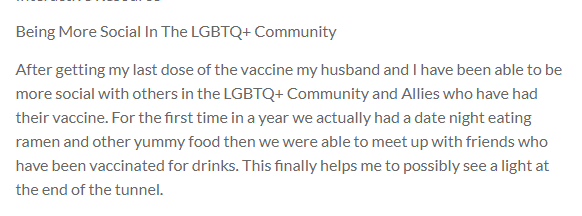 After getting my last dose of the vaccine my husband and I have been able to be more social with others in the LGBTQ+ Community and Allies who have had their vaccine. For the first time in a year we actually had a date night eating ramen and other yummy food then we were able to meet up with friends who have been vaccinated for drinks. This finally helps me to possibly see a light at the end of the tunnel.