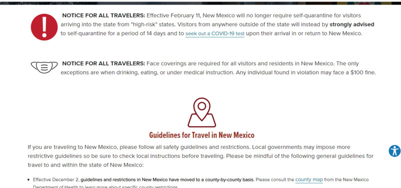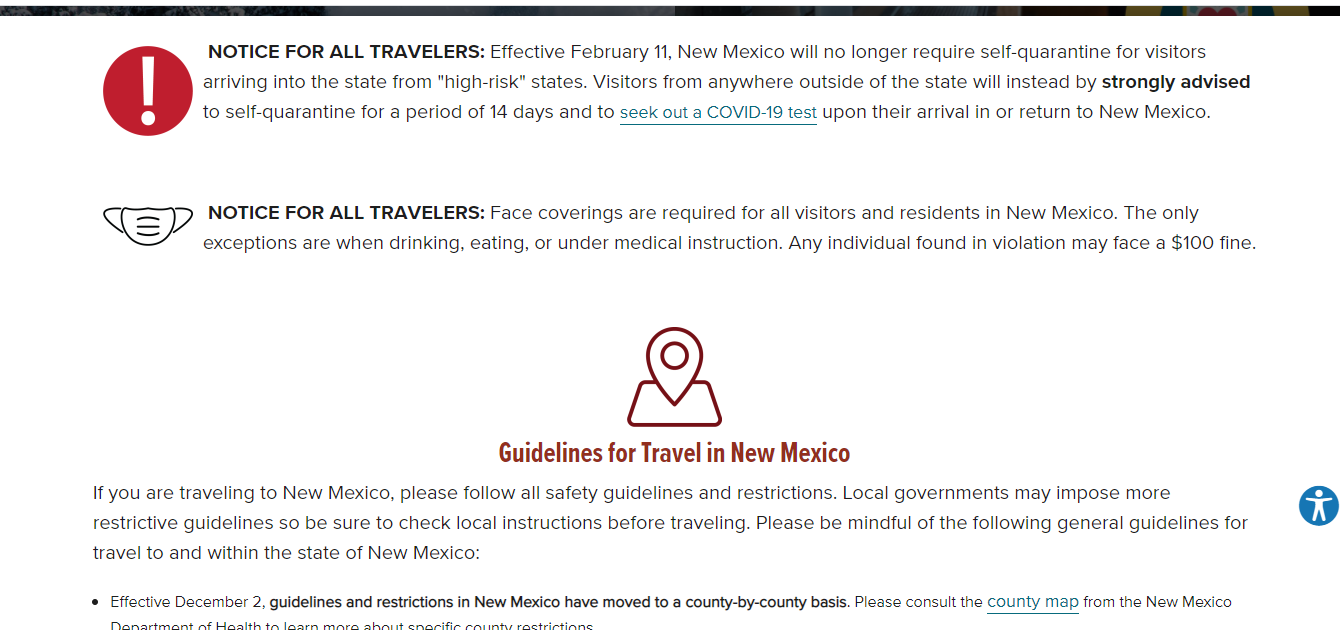 NOTICE FOR ALL TRAVELERS: Effective February 11, New Mexico will no longer require self-quarantine for visitors arriving into the state from "high-risk" states. Visitors from anywhere outside of the state will instead by strongly advised to self-quarantine for a period of 14 days and to seek out a COVID-19 test upon their arrival in or return to New Mexico.