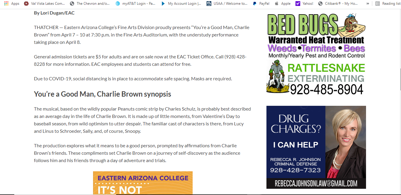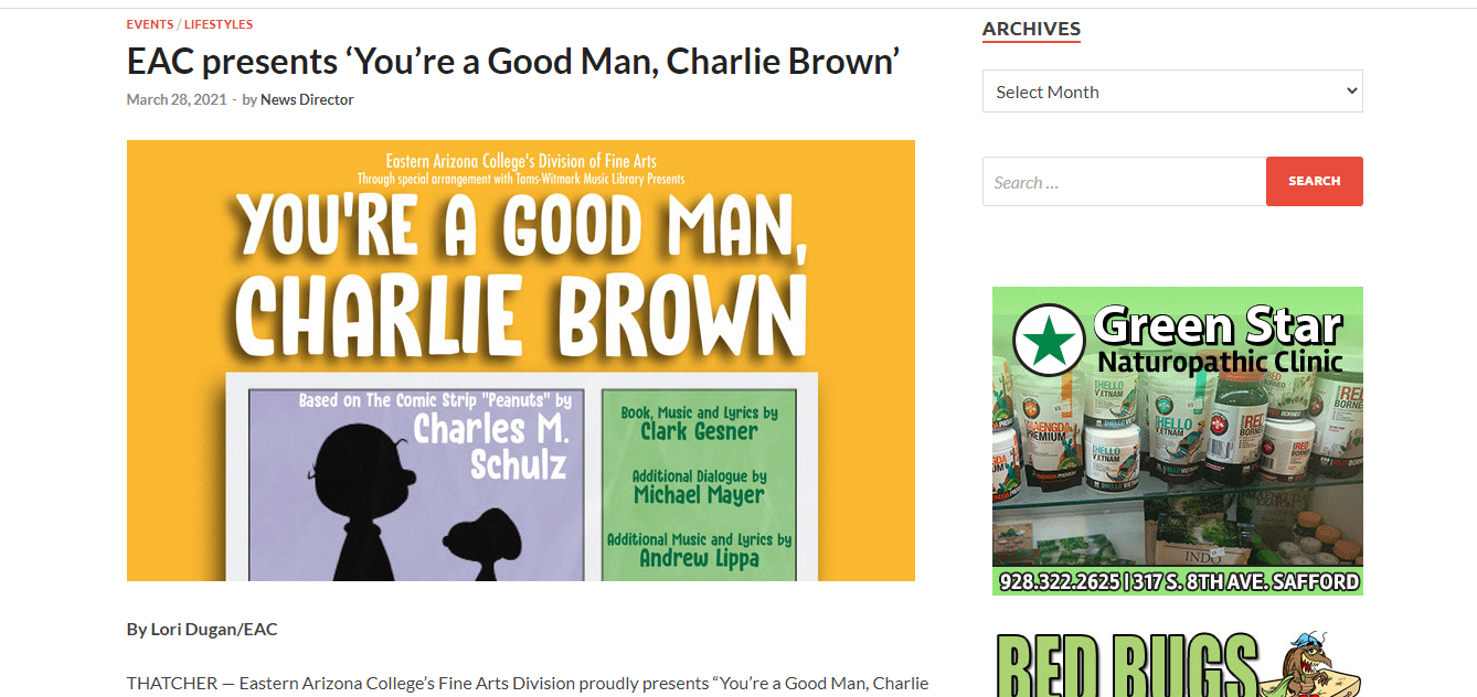 THATCHER — Eastern Arizona College’s Fine Arts Division proudly presents “You’re a Good Man, Charlie Brown” from April 7 – 10 at 7:30 p.m. in the Fine Arts Auditorium, with the understudy performance taking place on April 8.