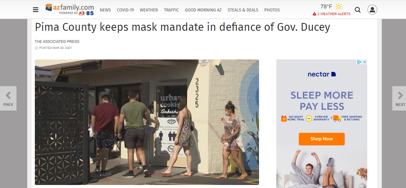 News Article: Pima County keeps mask mandate in defiance of Gov. Ducey