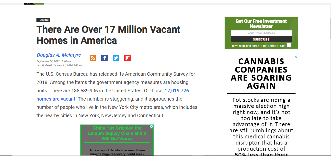 This article reports that they are over 17 million empty homes in the United States which greatly outnumbers the amount of homeless people in the country. The article then goes on to describe the location and other demographics of where these homes are. I wanted to include this article because it shows that we have the resources for people to not be homeless during the pandemic but there seems to be no incentive or interest in addressing this problem. The number of homes is so much greater and it could greatly mitigate some of the health and exposure issues homeless populations experience. This will allow me to show how homeless people are traditionally not even considered in resources.