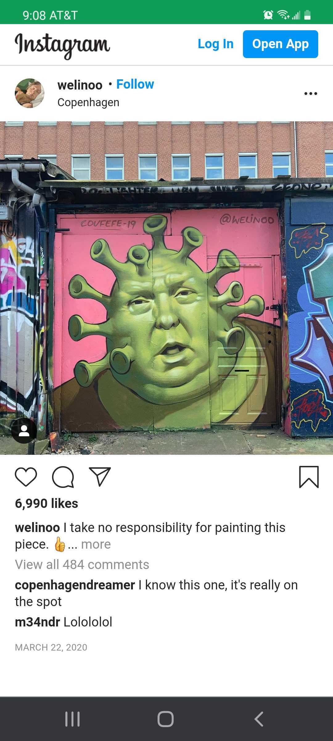 Andreas Wellin is a street artist from Denmark, residing in Copenhagen. Some of his recent mural work includes images and themes from the pandemic, including a sneezing woman, and a surreal image of Donald Trump as a COVID-19 virus/Shrek figure. The Shrek-COVID-Trump image includes a caption on the corresponding Instagram post: "I take no responsibility for painting this piece," which is a direct reference to Trump's statement in March 2020 regarding the pandemic, "I don't take responsibility at all.”