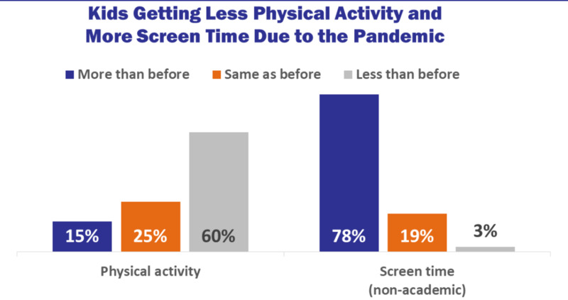 This link talks about the effects the pandemic has on children's nutritional health and physical activity. With parents already being stressed about managing through the pandemic, the quality of care for children had gone down. According to this site "Families report that during COVID-19 mitigation, time spent in physical activity and sports has decreased while sleep time and screen time have increased." It is understandable that this is an issue as children are limited from going outside as families fear for their health along with the lack of social life has caused children to sleep and use electronics more as a sense of coping from boredom. Not only is this affecting children now but will affect the future of these children as these will become habits, and habits are something that is hard to grow out of when they are developed since childhood.