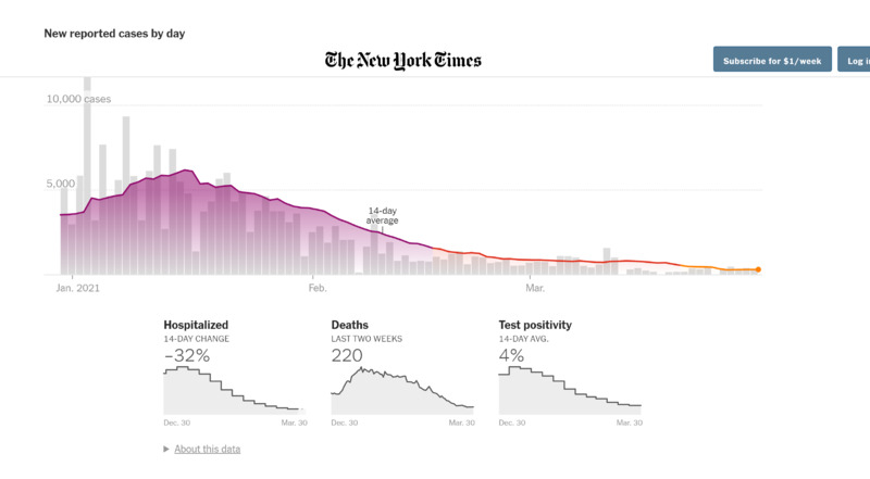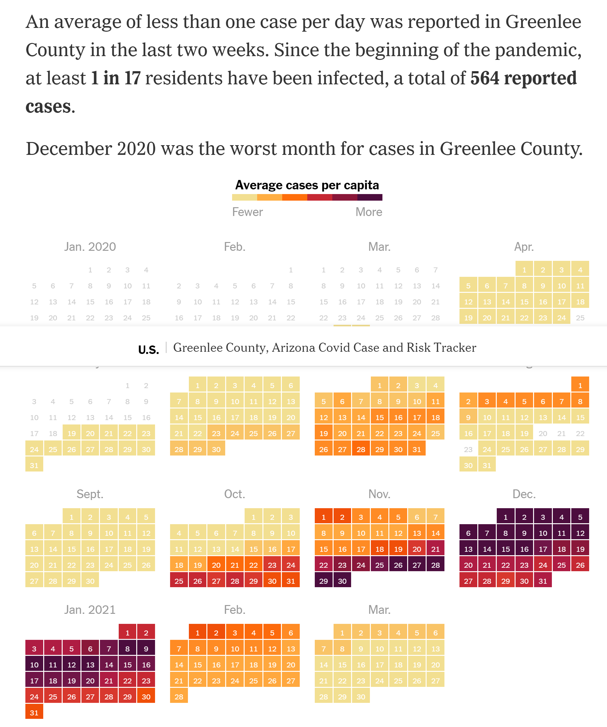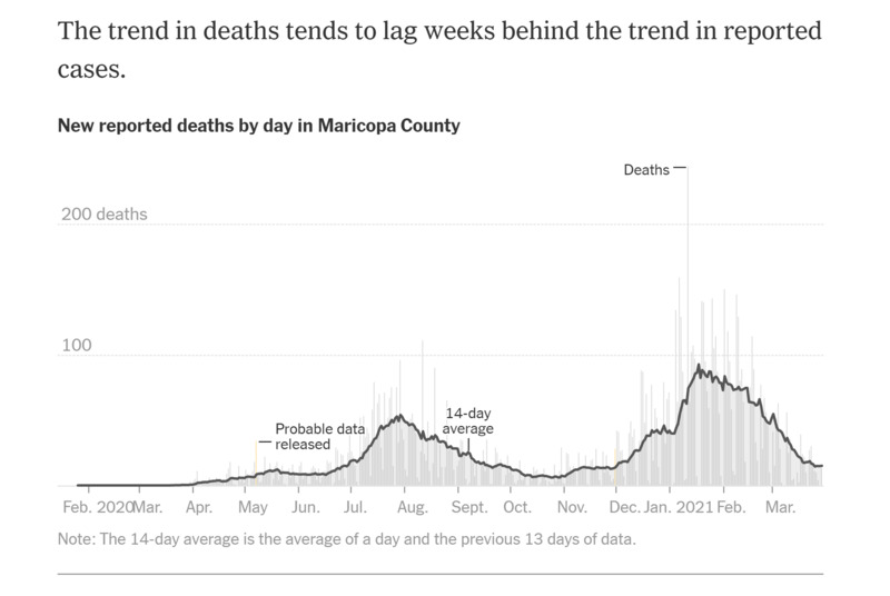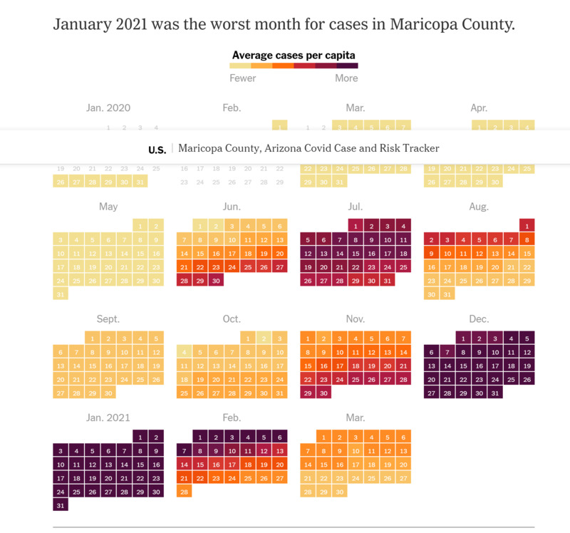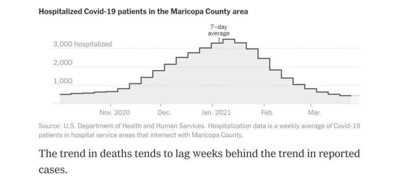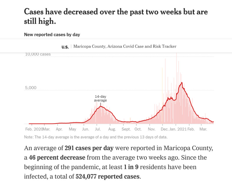 This daily tracker displayed on the New York Times site displays and explains public data provided by the Arizona Department of Health Services. The attached graphs illustrate the disparate COVID-19 experience between Arizona residents in Maricopa County and Greenlee County.