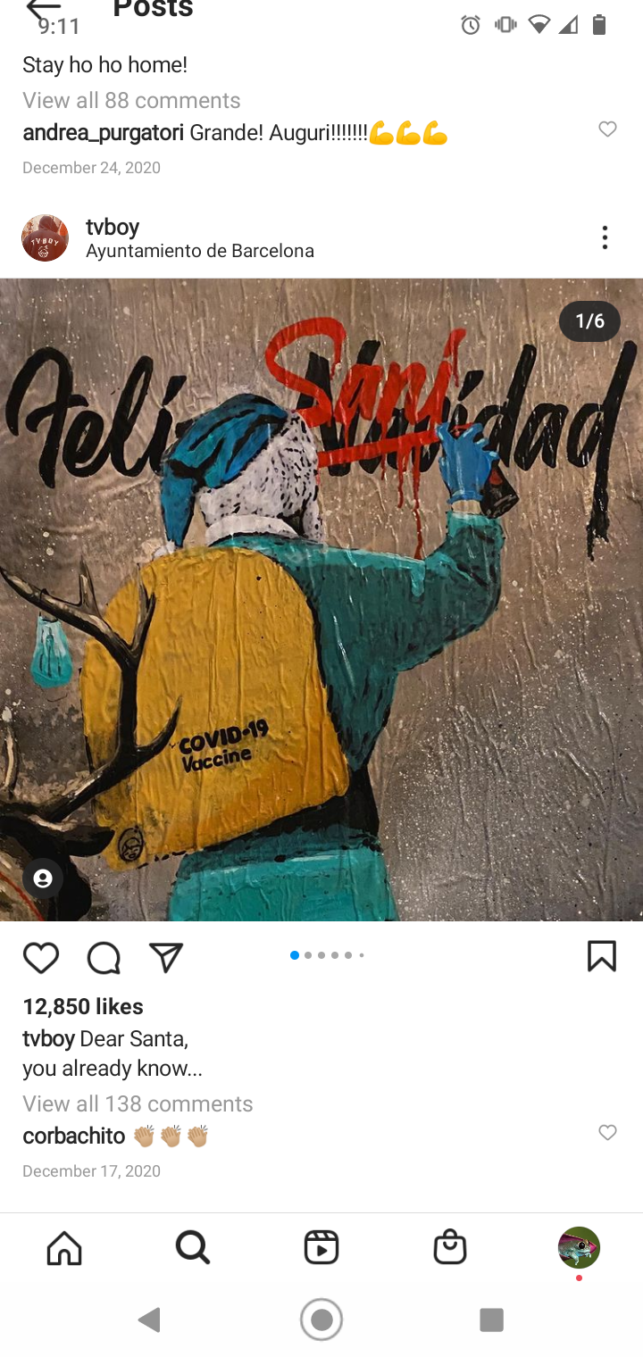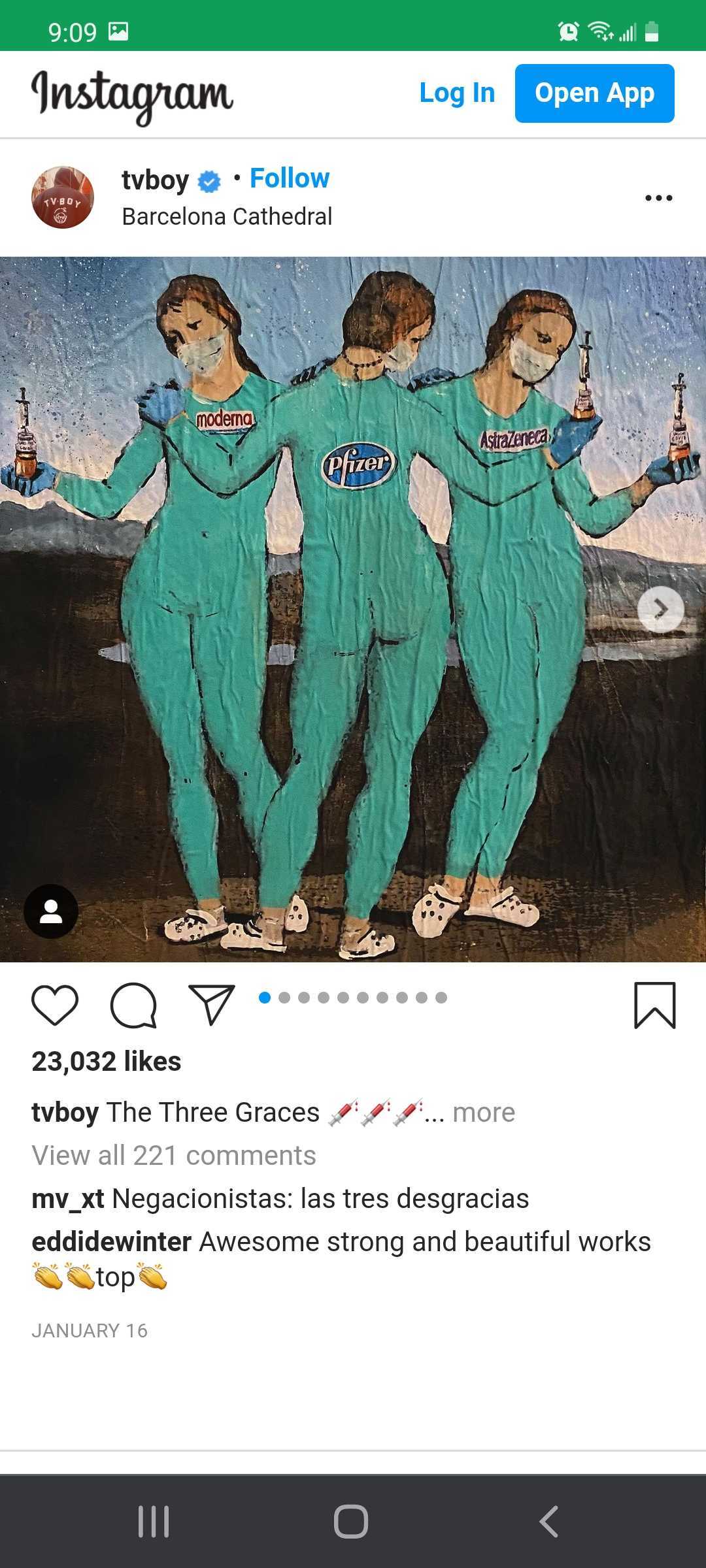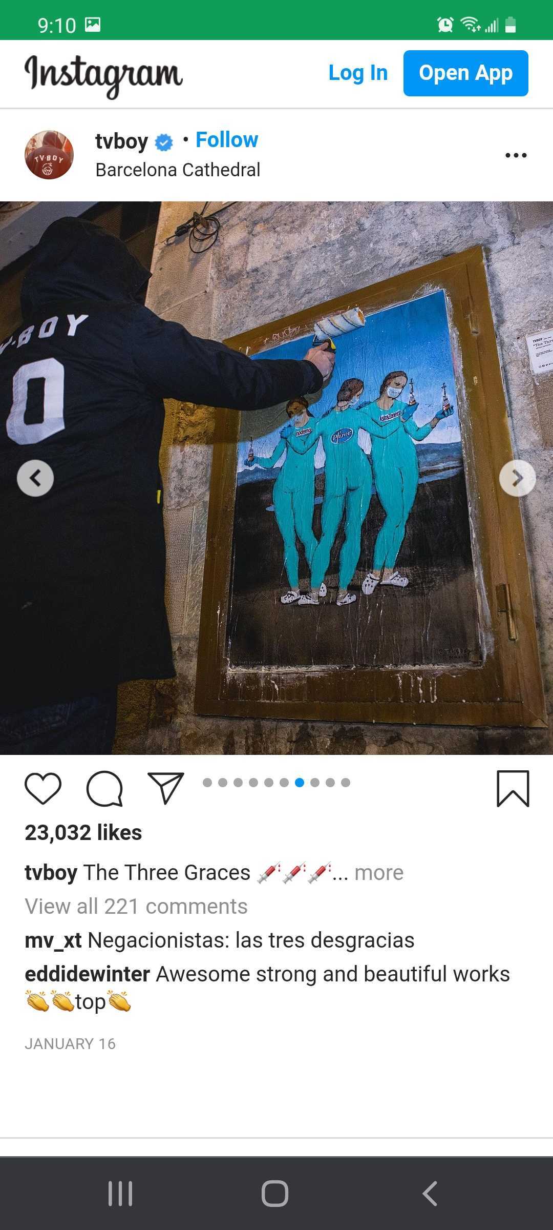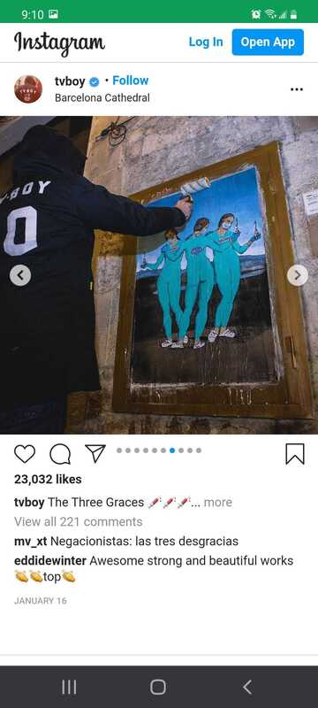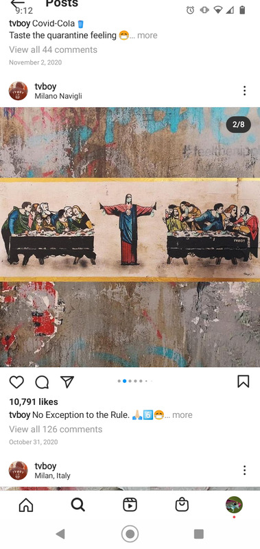 TVBoy is the artist name of Salvatore Benintende, Italian graffiti artist from based in Barcelona, Spain. Through the months of the pandemic, TVBoy has put up several wheat paste murals incorporating imagery of the pandemic, social justice issues, Catholic imagery, and political topics: a school of fish wearing masks; former President Trump in a Superman costume; the Sacred Heart Jesus figure wearing a mask; imagery of Antonio Canova’s statue The Three Graces (the mythological three charities, daughters of Zeus — Euphrosyne, Aglaea and Thalia — said to represent youth/beauty, mirth, and elegance) wearing form-fitting scrubs, clogs, masks, and representing three well known vaccines (Moderna, Pfizer, and AstraZeneca); imagery of Leonardo da Vinci's painting The Last Supper but with Jesus wearing a mask and separating two sides of the table; and others.