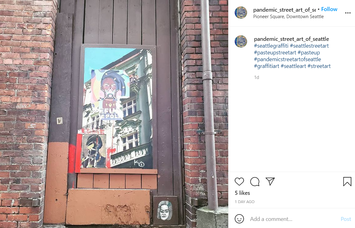 Malcolm Dole captures street art in Seattle, Washington. This piece shows a masked face perhaps layered over other art or perhaps an intentional effect.