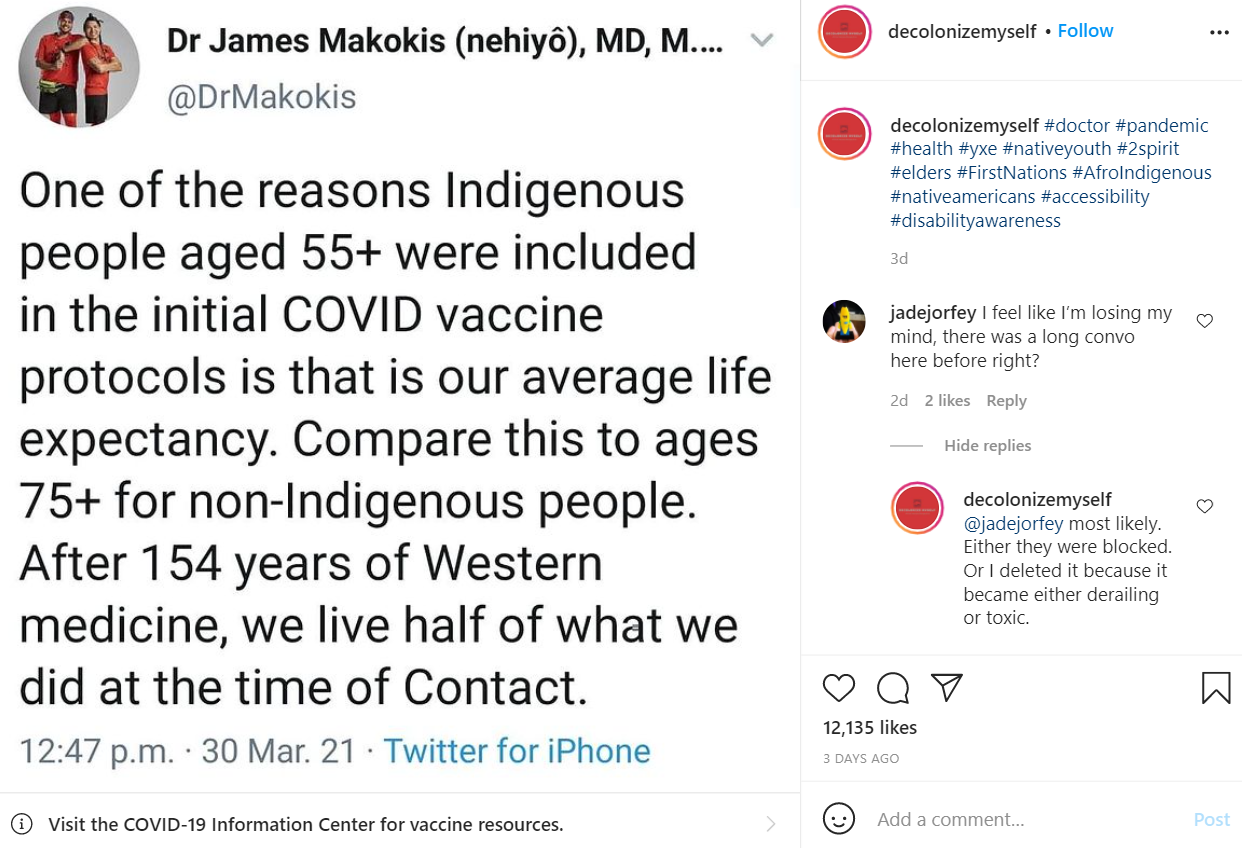 One of the reasons Indigenous people aged 55+ were included in the initial COVID vaccine protocols is that is our average life expectancy. Compare this to ages 75+ for non-Indigenous people. After 154 years of Western medicine, we live half of what we did at the time of Contact.