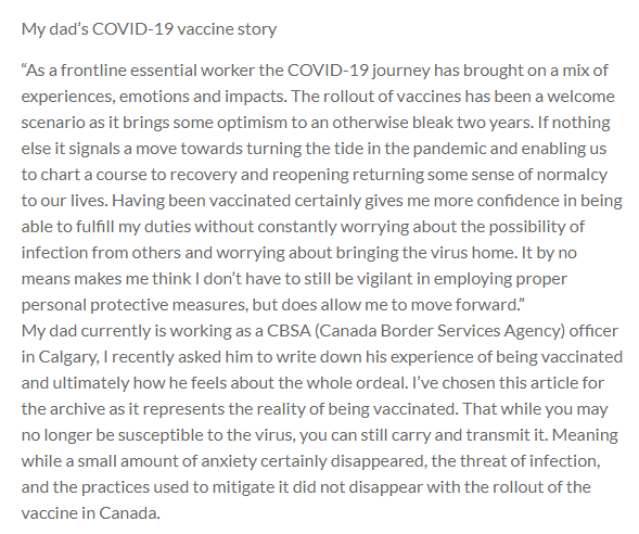 My dad currently is working as a CBSA (Canada Border Services Agency) officer in Calgary, I recently asked him to write down his experience of being vaccinated and ultimately how he feels about the whole ordeal. I’ve chosen this article for the archive as it represents the reality of being vaccinated. That while you may no longer be susceptible to the virus, you can still carry and transmit it. Meaning while a small amount of anxiety certainly disappeared, the threat of infection, and the practices used to mitigate it did not disappear with the rollout of the vaccine in Canada.