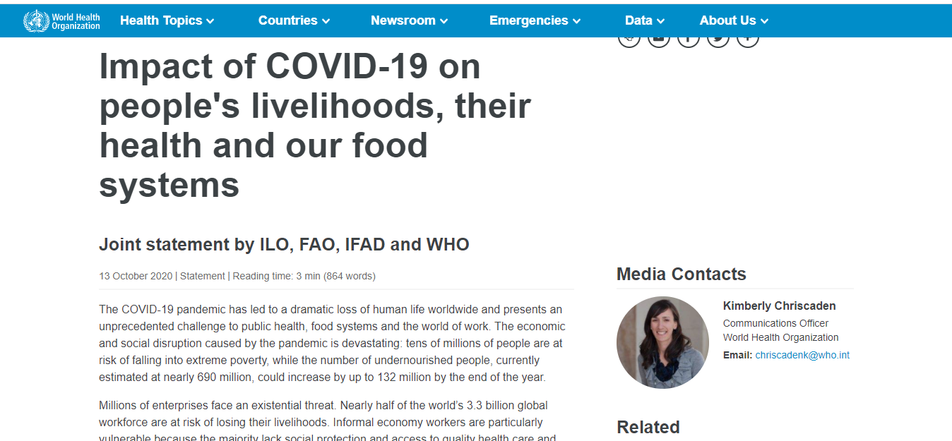 This article by the World Health Organization (WHO) talks about the effects of the COVID-19 pandemic on people’s livelihoods. The article says “tens of millions of people are at risk of falling into extreme poverty.” As a human living in a two story house that is food secure, this may just seem like a number. But extreme poverty is a human rights violation, and it is already clear the pandemic’s ripples are affecting people in serious ways. Further in the article, it starts to talk about the effects on the food and trade industry, which includes issues with closed borders, farmers being able to sell their food, and even people accessing healthy foods.