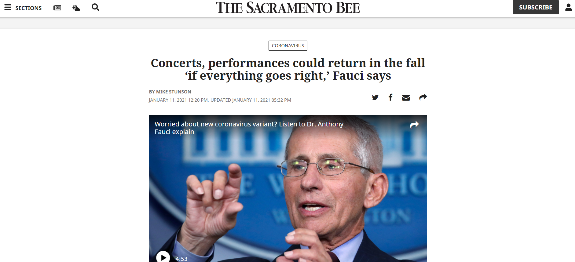 Dr. Anthony Fauci offered hope that concerts and theater performances could return in 2021.