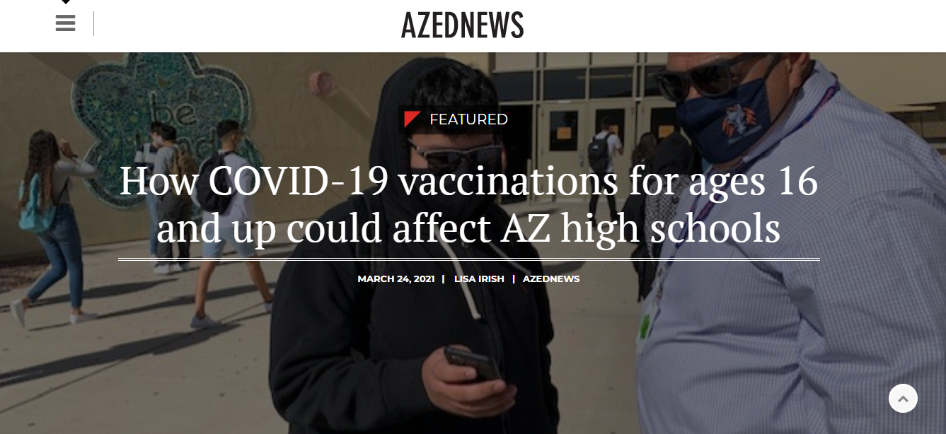 (Monday, March 22, 2021) Gov. Doug Ducey announced that Arizonian's ages 16 and up would be eligible for COVID vaccines. In particular, the counties of Pima, Maricopa, and Yuma are interesting in administering the vaccines in an effort to produce "a positive impact on schools and our community." The statement from the governor comes after the executive order mandating that districts that are non deemed as "high transmission" counties. District leaders and health experts are hopeful that as more students and staff are vaccinated it will reduce transmission levels and ultimately produce an environment safe for all.
