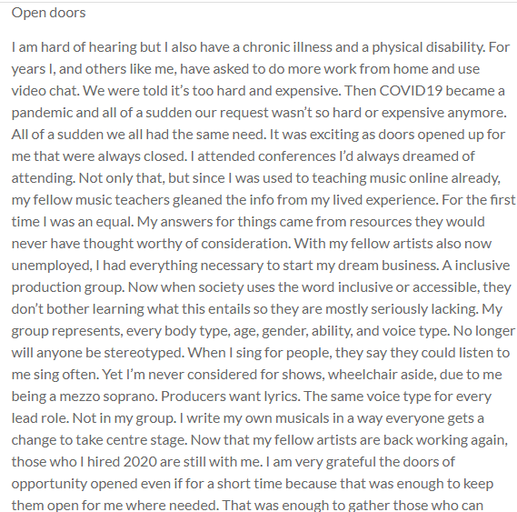 I am hard of hearing but I also have a chronic illness and a physical disability. For years I, and others like me, have asked to do more work from home and use video chat. We were told it’s too hard and expensive. Then COVID19 became a pandemic and all of a sudden our request wasn’t so hard or expensive anymore. All of a sudden we all had the same need. It was exciting as doors opened up for me that were always closed. I attended conferences I’d always dreamed of attending. Not only that, but since I was used to teaching music online already, my fellow music teachers gleaned the info from my lived experience. For the first time I was an equal. My answers for things came from resources they would never have thought worthy of consideration. With my fellow artists also now unemployed, I had everything necessary to start my dream business. A inclusive production group. Now when society uses the word inclusive or accessible, they don’t bother learning what this entails so they are mostly seriously lacking. My group represents, every body type, age, gender, ability, and voice type. No longer will anyone be stereotyped. When I sing for people, they say they could listen to me sing often. Yet I’m never considered for shows, wheelchair aside, due to me being a mezzo soprano. Producers want lyrics. The same voice type for every lead role. Not in my group. I write my own musicals in a way everyone gets a change to take centre stage. Now that my fellow artists are back working again, those who I hired 2020 are still with me. I am very grateful the doors of opportunity opened even if for a short time because that was enough to keep them open for me where needed. That was enough to gather those who can make and keep this dream a reality. We are set to debut our first show in June 2021. It doesn’t get better than that. So while COVID itself is horrendous, the lifestyle the pandemic made universal helped others see what we live daily, and it also created a more universal work place for all.