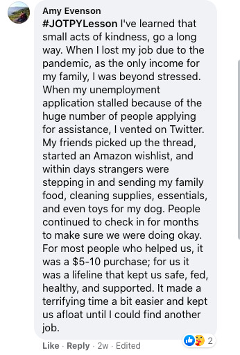 I've learned that small acts of kindness, go a long way. When I lost my job due to the pandemic, as the only income for my family, I was beyond stressed. When my unemployment application stalled because of the huge number of people applying for assistance, I vented on Twitter. My friends picked up the thread, started an Amazon wishlist, and within days strangers were stepping in and sending my family food, cleaning supplies, essentials, and even toys for my dog. People continued to check in for months to make sure we were doing okay. For most people who helped us, it was a $5-10 purchase; for us it was a lifeline that kept us safe, fed, healthy, and supported. It made a terrifying time a bit easier and kept us afloat until I could find another job.