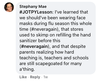 I’ve learned that we should’ve been wearing face masks during flu season this whole time (#neveragain), that stores used to skimp on refilling the hand sanitizer before this (#neveragain), and that despite parents realizing how hard teaching is, teachers and schools are still scapegoated for many a’thing.