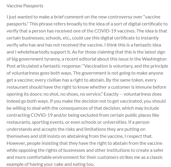 I just wanted to make a brief comment on the new controversy over “vaccine passports.” This phrase refers broadly to the idea of a sort of digital certificate to verify that a person has received one of the COVID-19 vaccines. The idea is that certain businesses, schools, etc., could use this digital certificate to instantly verify who has and has not received the vaccine. I think this is a fantastic idea and I wholeheartedly support it. As for those claiming that this is the latest sign of big government tyranny, a recent editorial about this issue in the Washington Post articulated a fantastic response: “Vaccination is voluntary, and the principle of voluntariness goes both ways. The government is not going to make anyone get a vaccine; every civilian has a right to abstain. By the same token, every restaurant should have the right to know whether a customer is immune before opening its doors: no shot, no shoes, no service.” Exactly -- voluntariness does indeed go both ways. If you make the decision not to get vaccinated, you should be willing to deal with the consequences of that decision, which may include contracting COVID-19 and/or being excluded from certain public places like restaurants, sporting events, or even schools or universities. If a person understands and accepts the risks and limitations they are putting on themselves and still insists on abstaining from the vaccine, I respect that. However, people insisting that they have the right to abstain from the vaccine while opposing the rights of businesses and other institutions to create a safer and more comfortable environment for their customers strikes me as a classic example of having your cake and eating too.