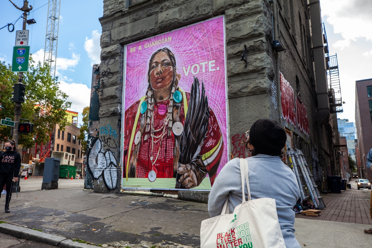 Indigenous land stewardship is a relatively new term, forged to compel more people to live in closer relationship with the land. As our world passes through multiple crises of our making, racial justice is the ultimate issue, and goal. As such, across many of the pieces commissioned by Nia Tero is the relationship between Black liberation and Indigenous sovereignty. A key message in these posters is the encouragement for people to get out and vote, use their voices to effect change on these critical issues and uplift diversity in leadership.
