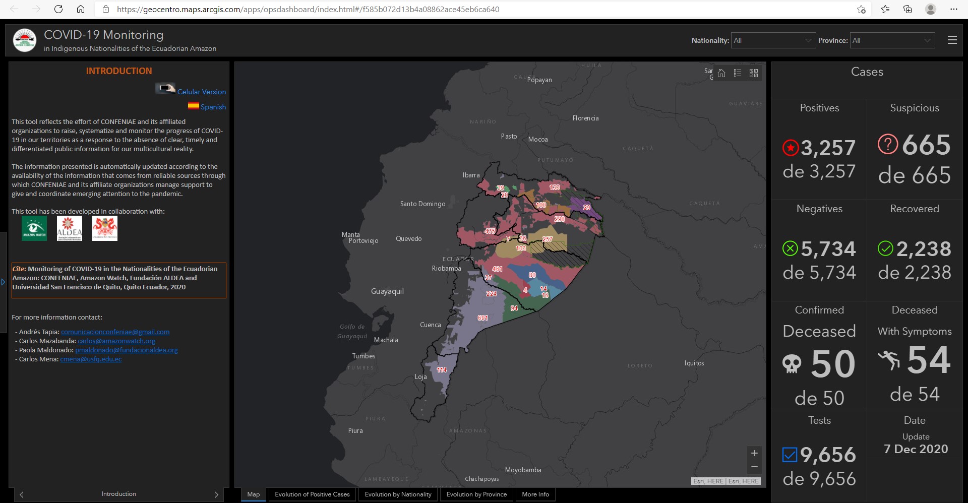 "La presente herramienta recoge el esfuerzo de la CONFENIAE y sus organizaciones filiales por levantar, sistematizar y monitorear el avance del COVID-19 en nuestros territorios como una respuesta a la ausencia de información pública clara, oportuna y diferenciada para nuestra realidad pluricultural.