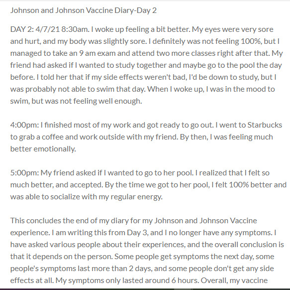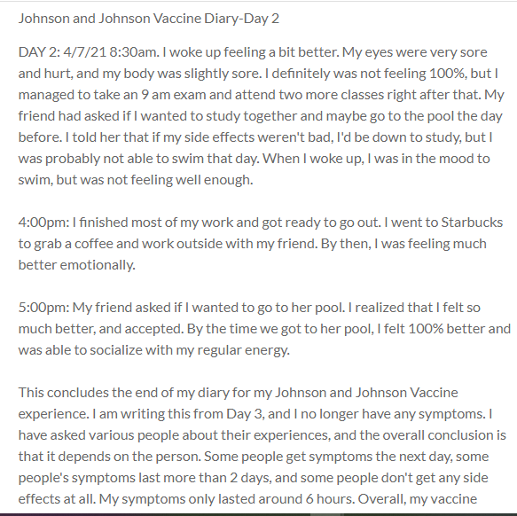 This concludes the end of my diary for my Johnson and Johnson Vaccine experience. I am writing this from Day 3, and I no longer have any symptoms. I have asked various people about their experiences, and the overall conclusion is that it depends on the person. Some people get symptoms the next day, some people's symptoms last more than 2 days, and some people don't get any side effects at all. My symptoms only lasted around 6 hours. Overall, my vaccine experience was nothing surprising and went smoothly. Although the side effects were not ideal, they are more of a minor inconvenience.