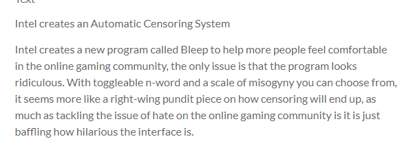 Intel creates a new program called Bleep to help more people feel comfortable in the online gaming community, the only issue is that the program looks ridiculous. With toggleable n-word and a scale of misogyny you can choose from, it seems more like a right-wing pundit piece on how censoring will end up, as much as tackling the issue of hate on the online gaming community is it is just baffling how hilarious the interface is.